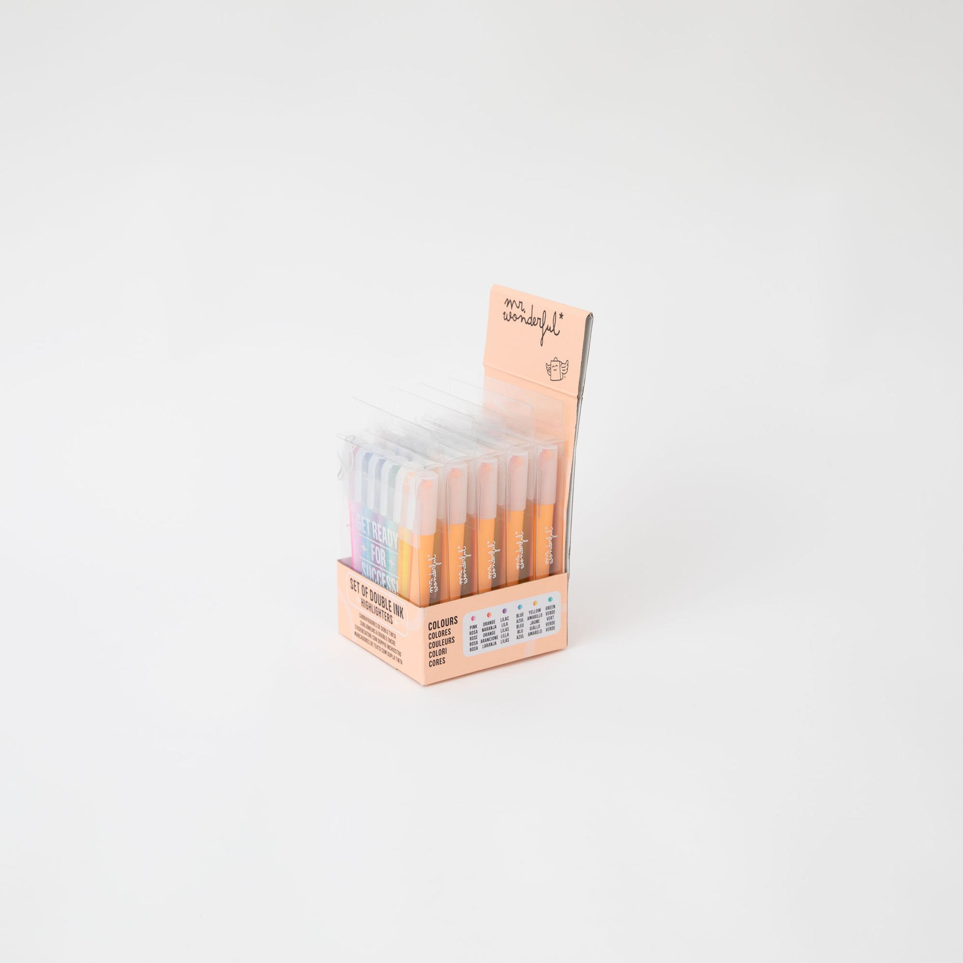 Haz que tus ideas destaquen (¡y por partida doble!) con este set de subrayadores de tinta doble de Mr. Wonderful. Cada uno cuenta con dos puntas de distinto color para que puedas organizar, subrayar o decorar tus apuntes de forma creativa, práctica y muy visual.