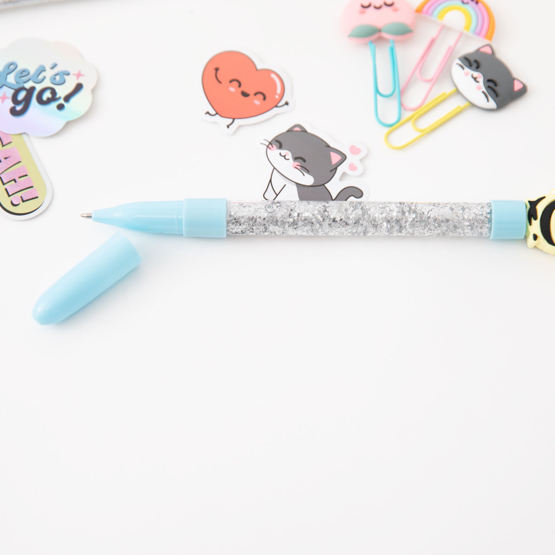 Divertido set de escritura compuesto por 1 estuche transparente con cierre de cremallera, 1 boli con tinta azul, 3 clips y 6 pegatinas.