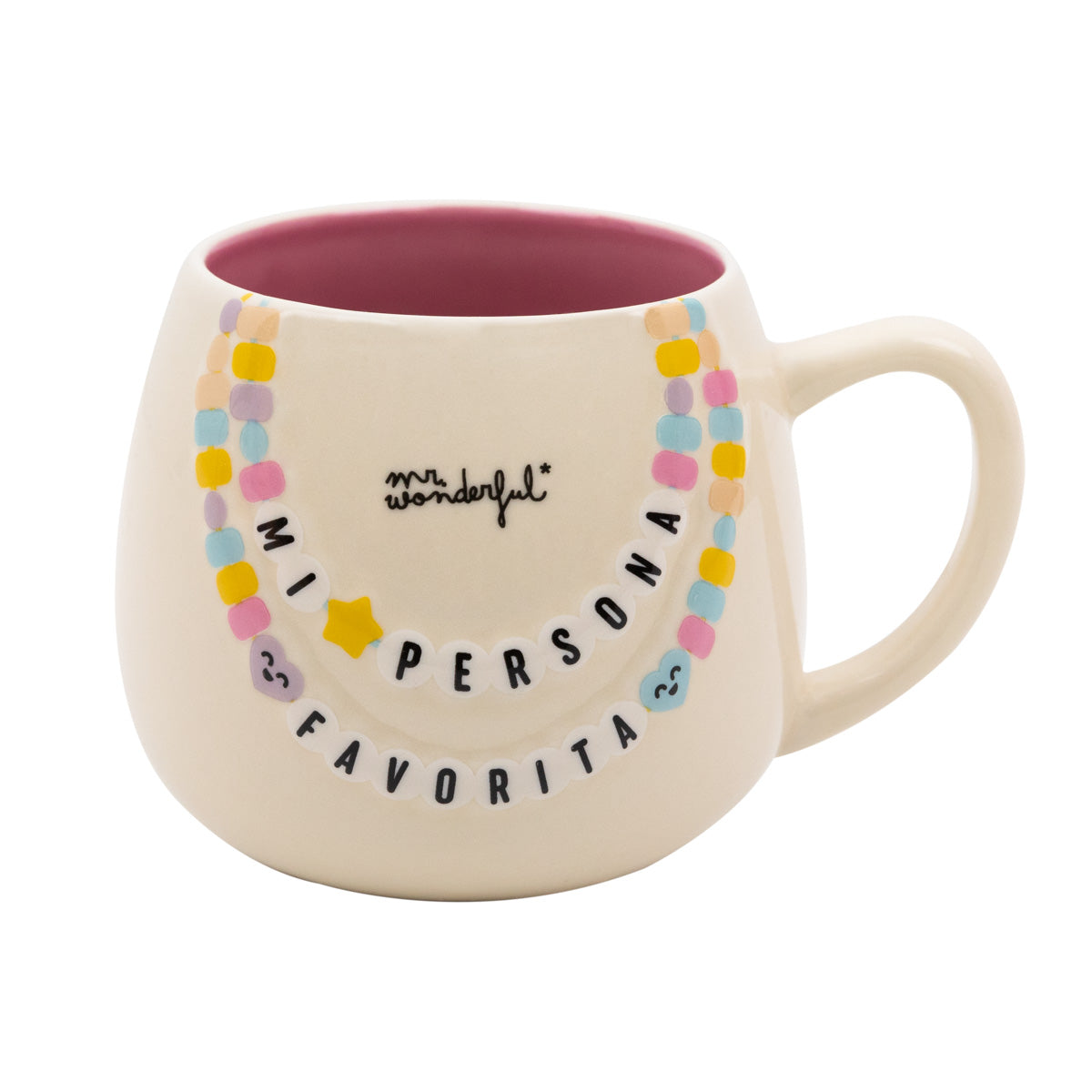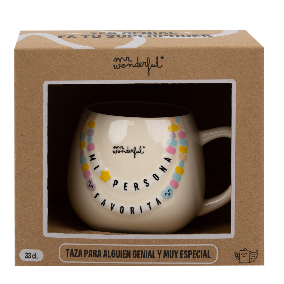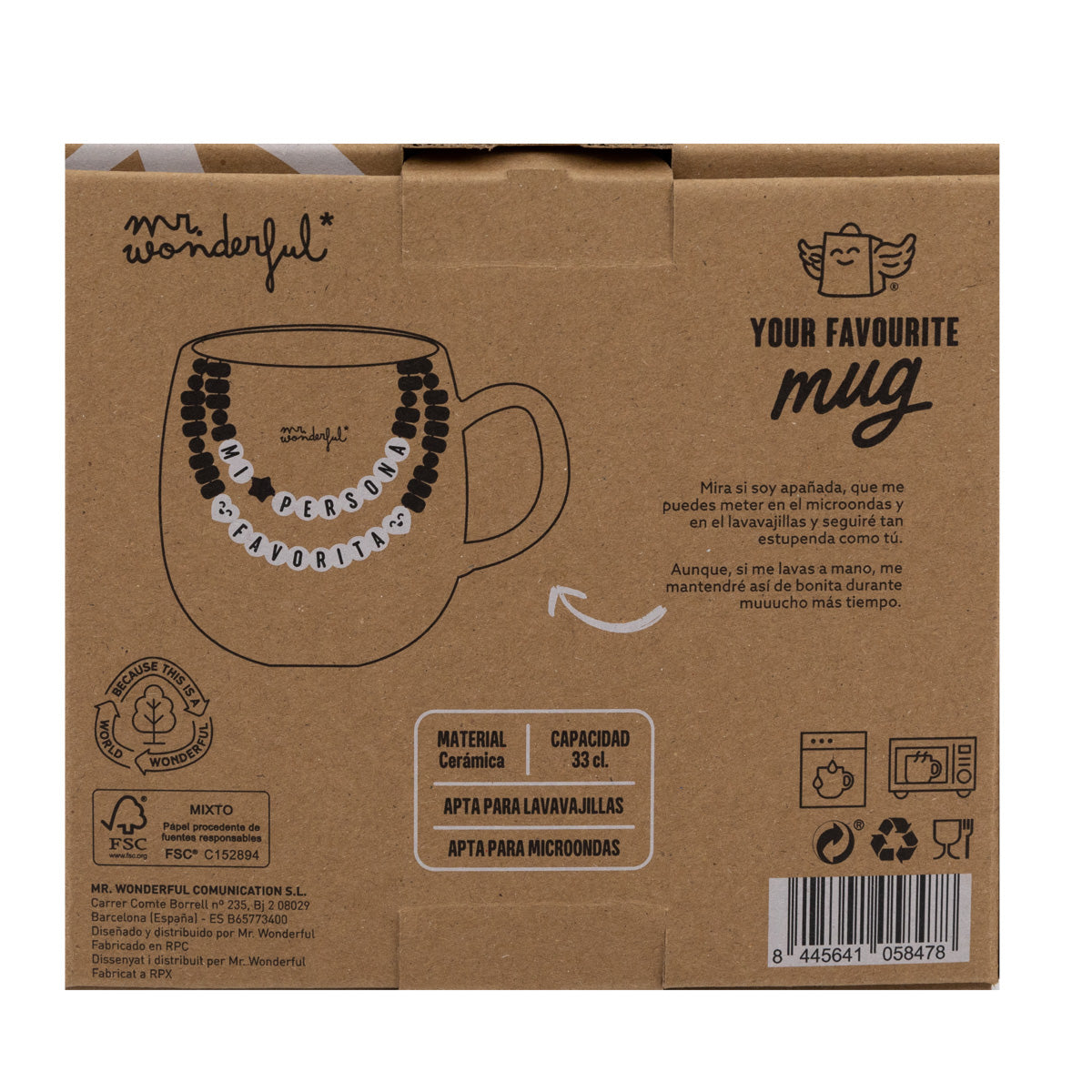 Taza realizada en cerámica con mensaje de amistad. El mensaje se encuentra en una pulsera de la amistad, realizada también en cerámica, y que forma parte del diseño en 3D de la taza.