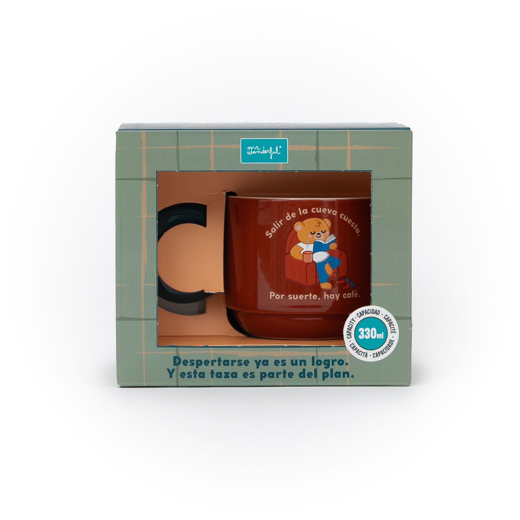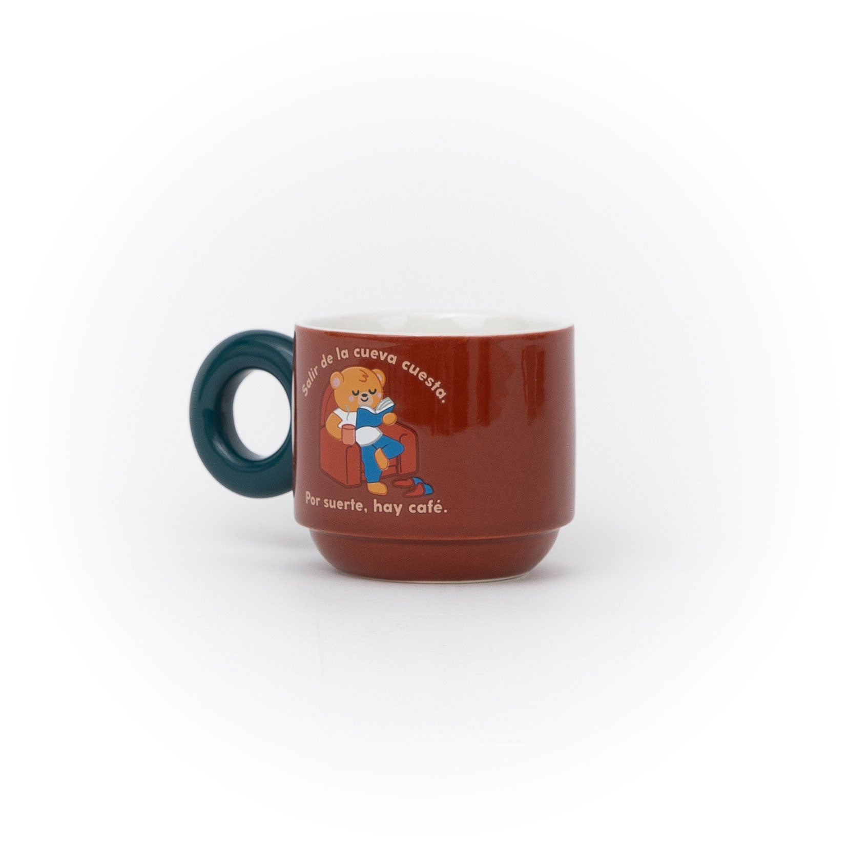 Esta taza apilable para papá es el regalo perfecto para el Día del Padre si buscas algo práctico, con humor y mucho cariño. Incluye una ilustración de un papá oso descansando en su sofá mientras lee tranquilamente su libro, acompañada del mensaje “Salir de la cueva cuesta. Por suerte, hay café”.