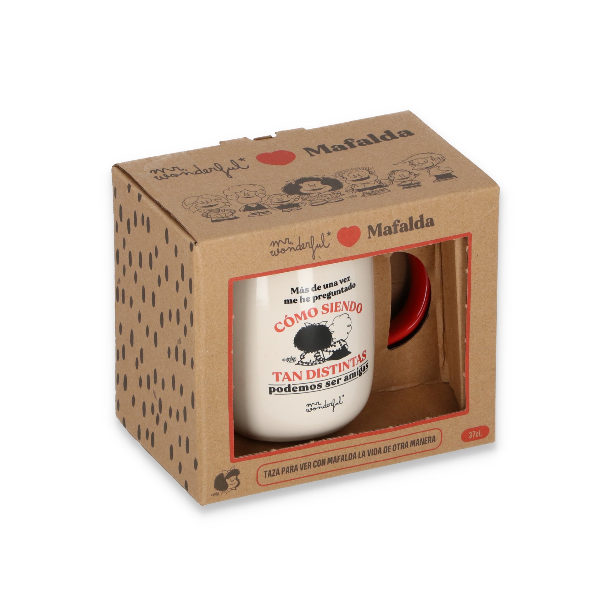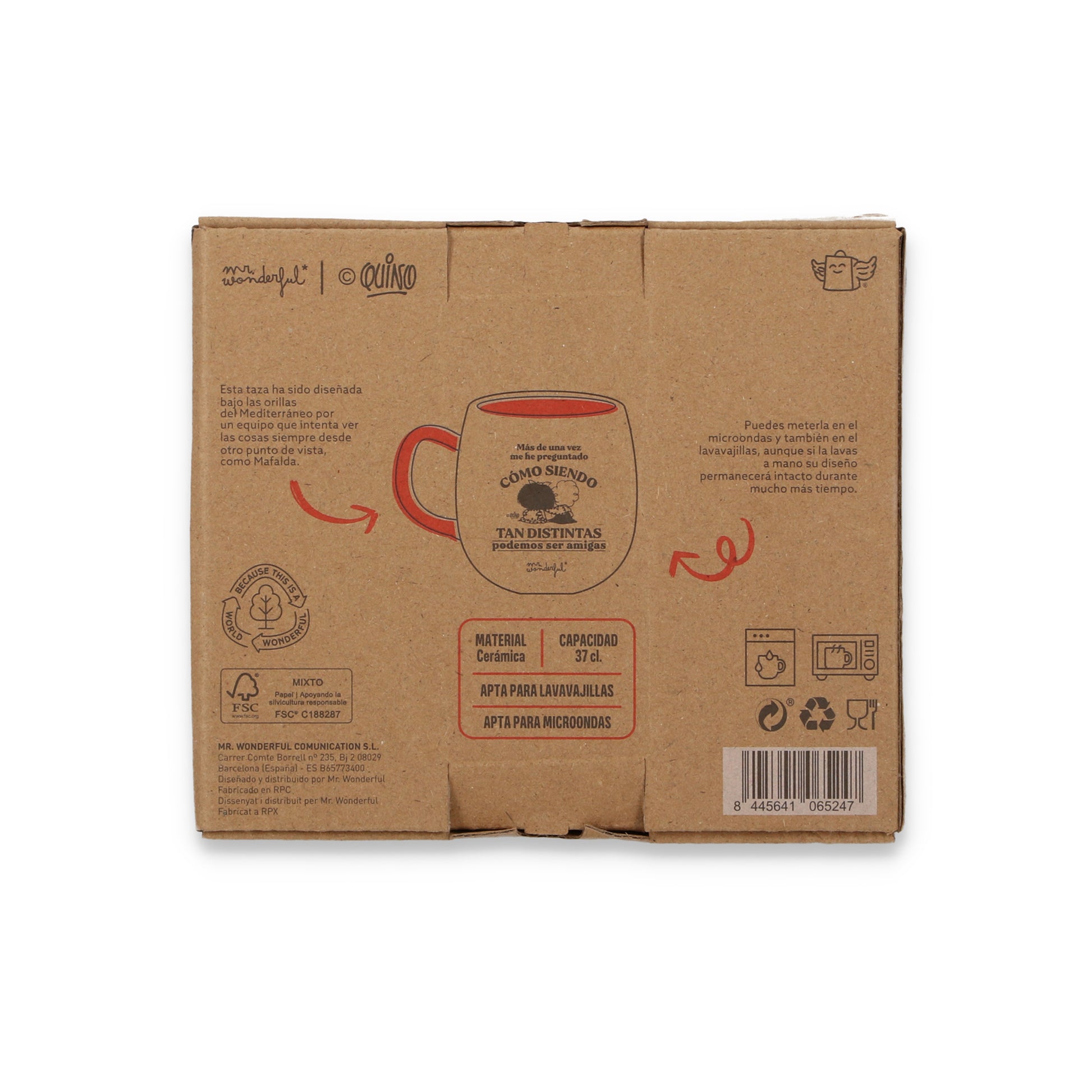Taza de cerámica con Mafalda como total protagonista, con un mensaje de amistad cuyo autor es Quino. Capacidad: 37 cl.