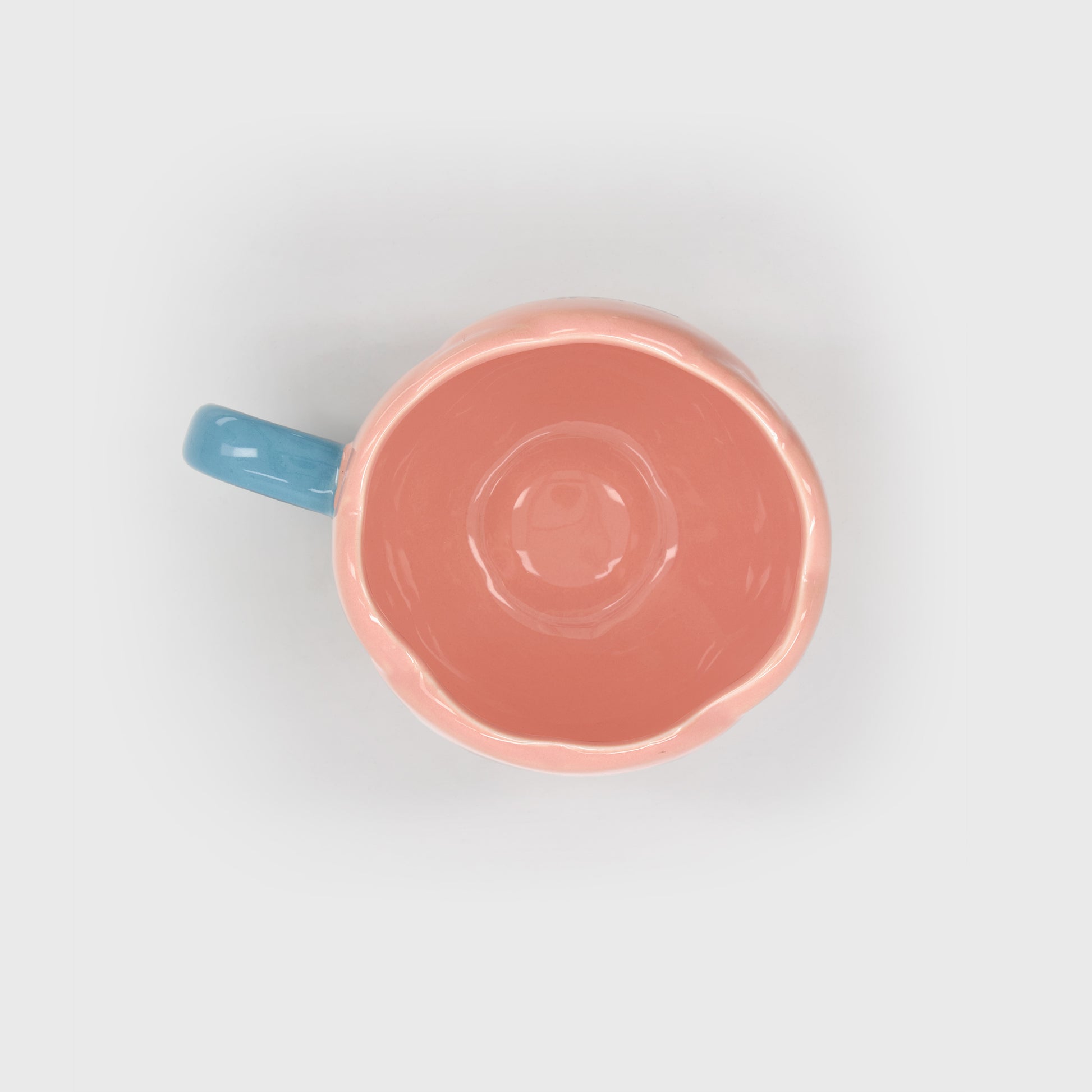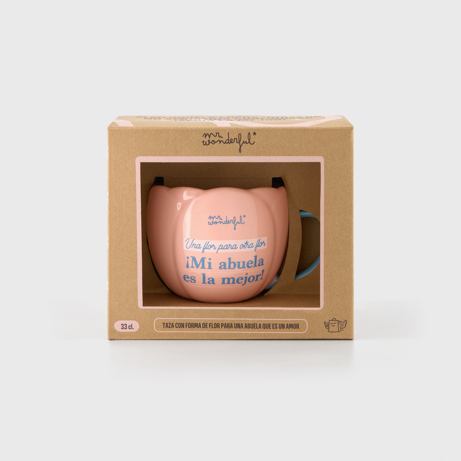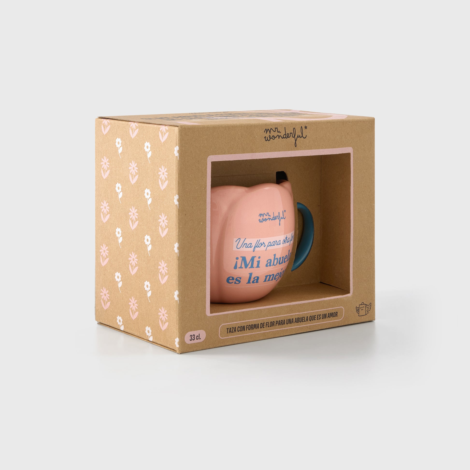 Taza realizada en cerámica con forma de rosa con mensaje para abuelas. el cual guarda relación con la forma de la taza.