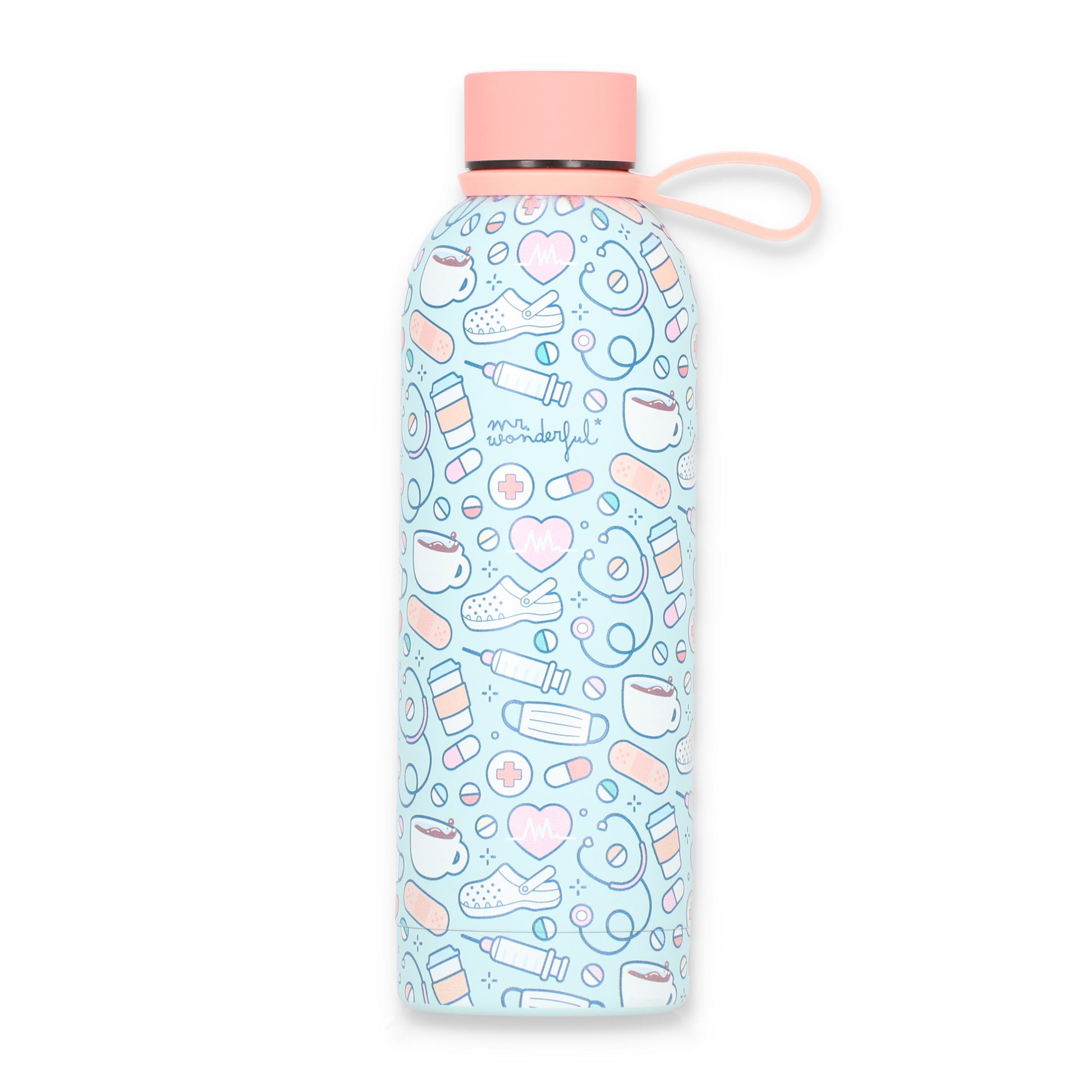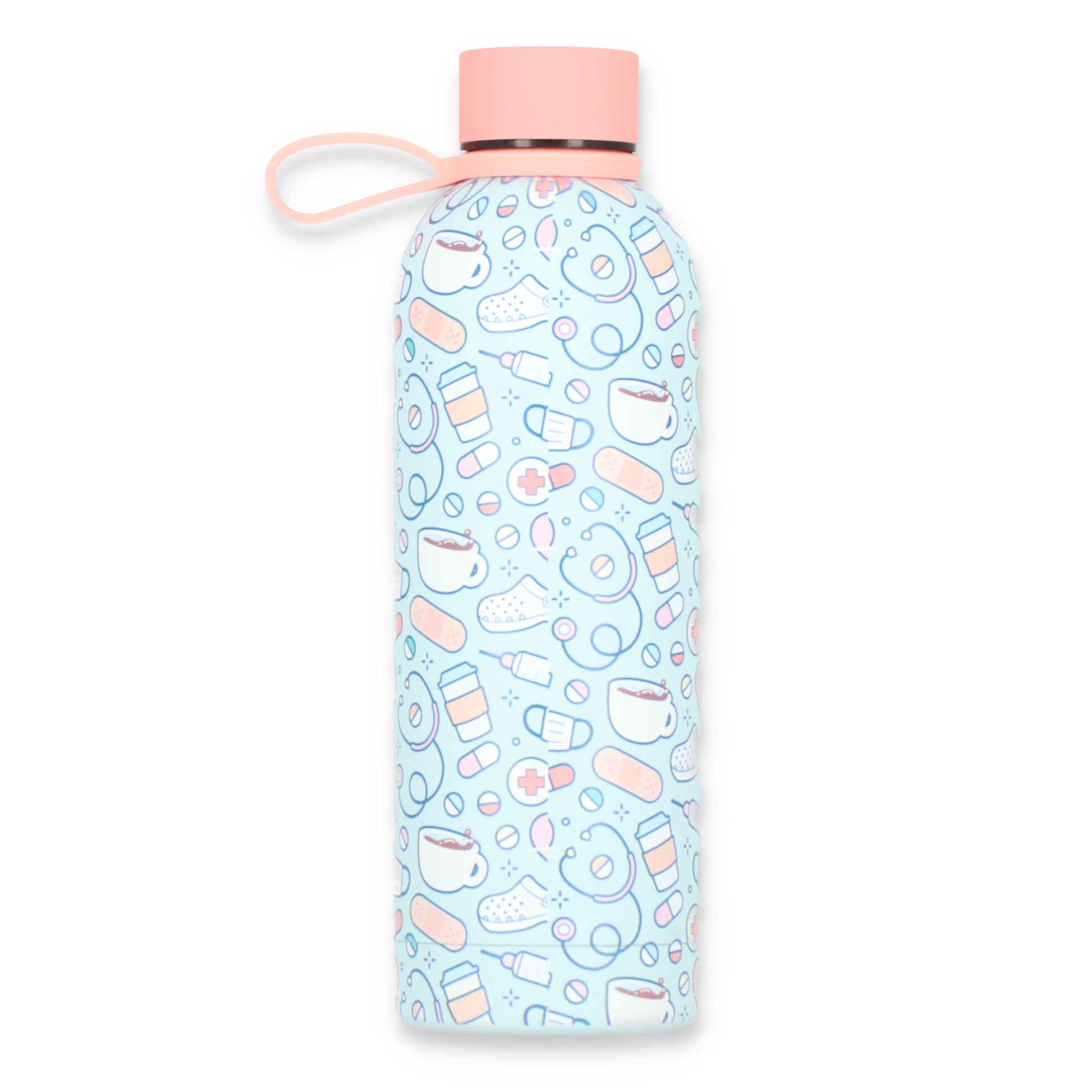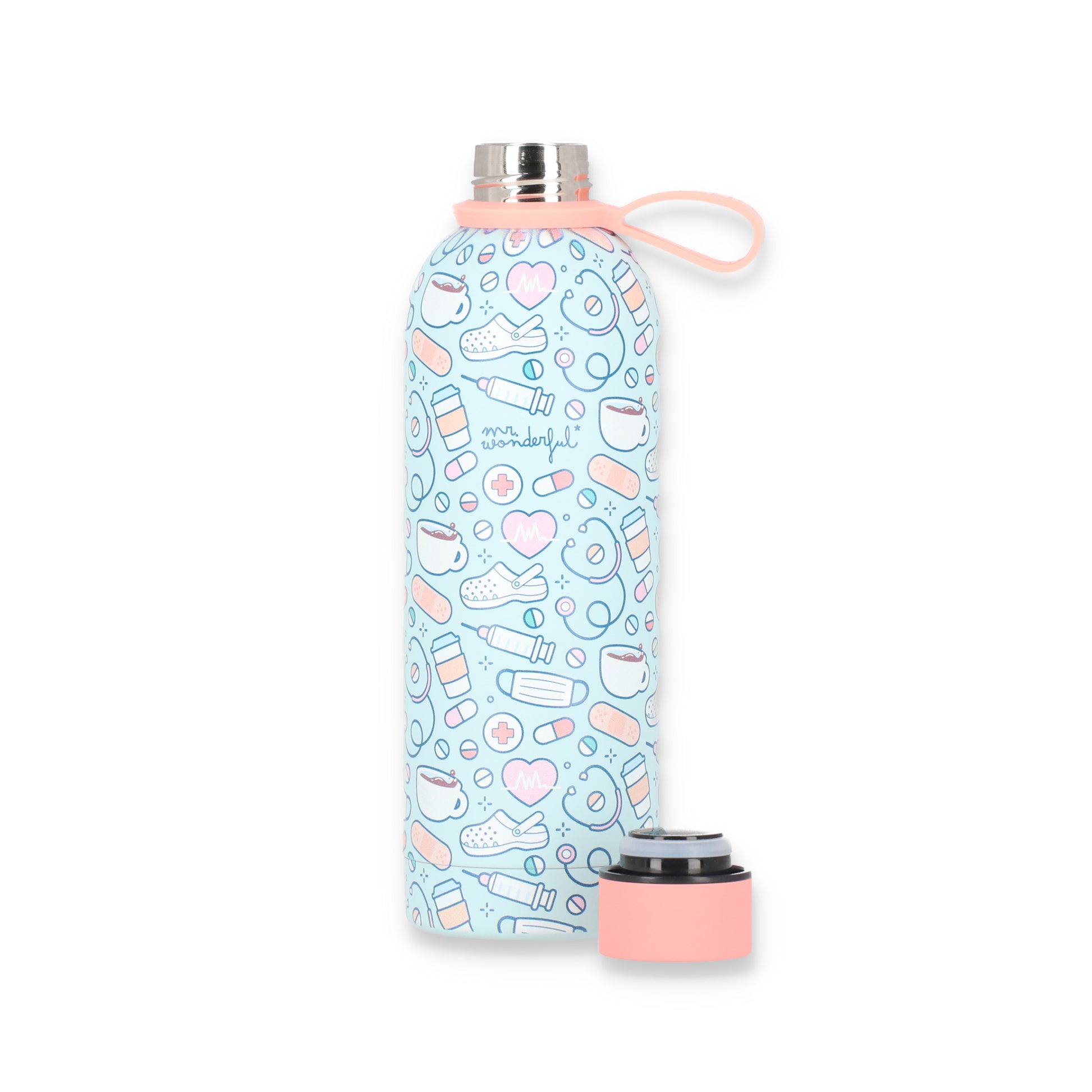 Botella térmica de 500 ml de capacidad realizada en acero inoxidable 304 de doble capa. Con tapón hermético y asa de silicona para transportarla cómodamente.