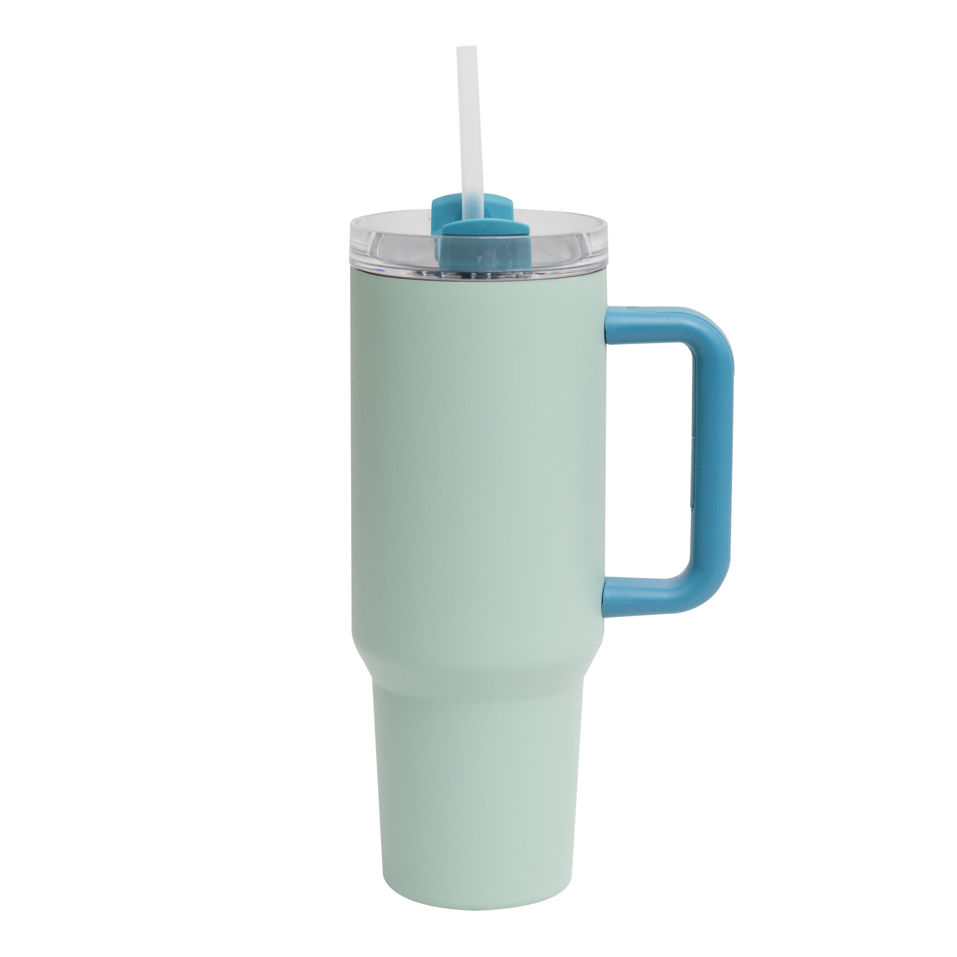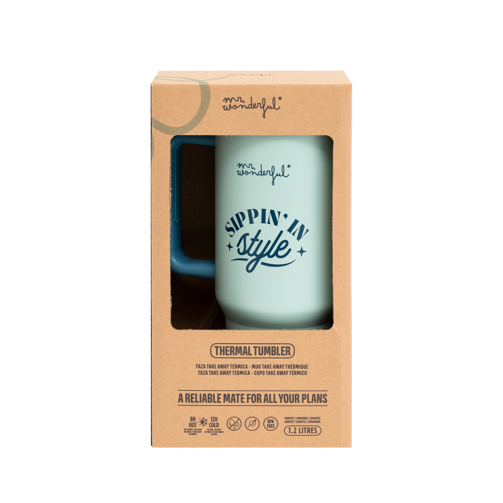 Taza take away térmica de 1,2 litros de capacidad (40oz), realizada con acero inoxidable de doble pared, con aislamiento al vacío. Mantiene el calor durante 8 horas y el frío durante 12 horas. Totalmente libre de BPA, su asa grande y su pajita incorporada la hacen muy práctica al uso. Además, su base estrecha cabe en el portavasos del coche.