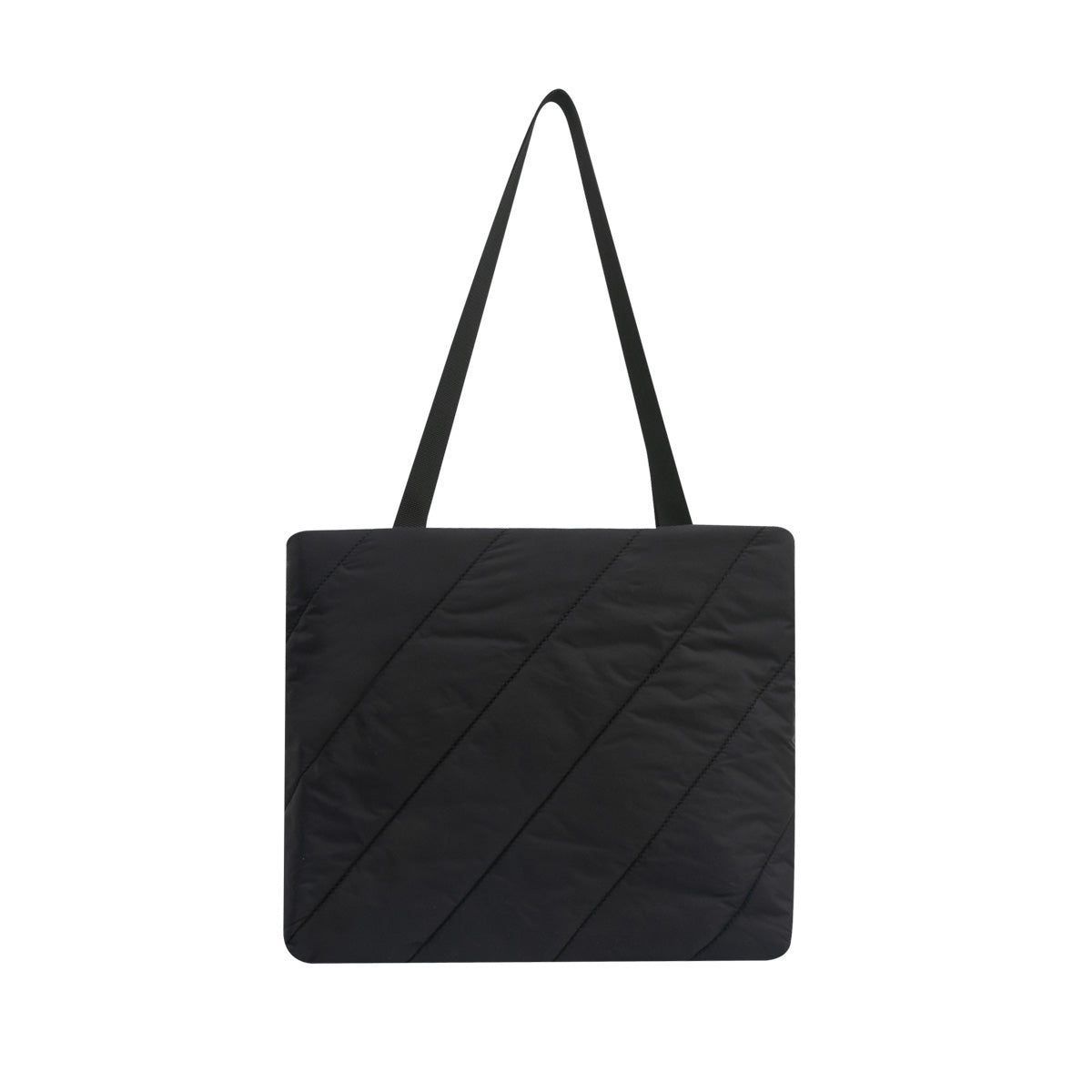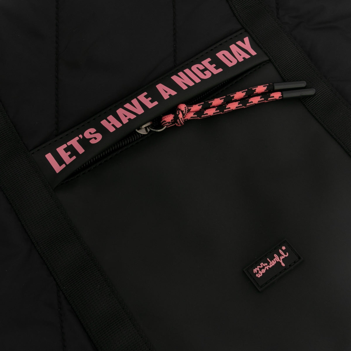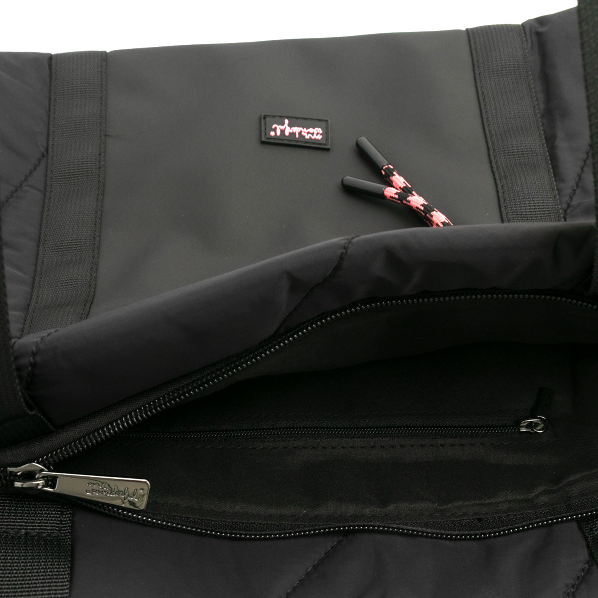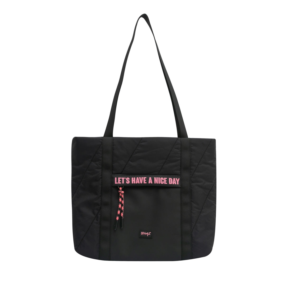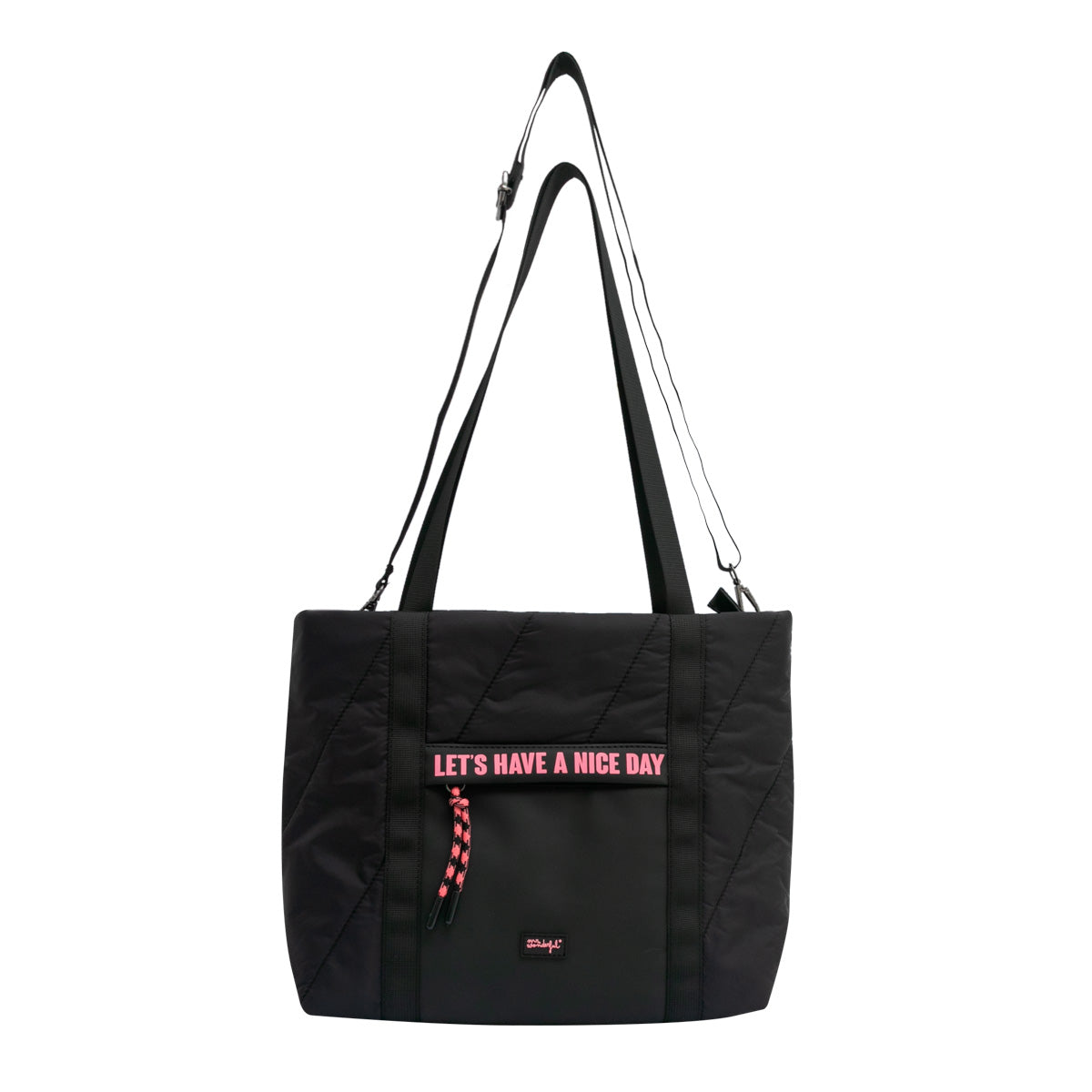 Bolso acolchado tipo tote bag, realizado en?poliéster. Con dos?asas más cortas y?otra de?longitud regulable, más larga, para poderlo llevar en?bandolera. Con cierre de?cremallera y?un?bolsillo interior pequeñito, también con?cierre de?cremallera. Cuenta además con?un?bolsillo en?su?parte frontal, cuyo cierre de?cremallera queda oculto por?una?tira con?un?mensaje en?inglés.