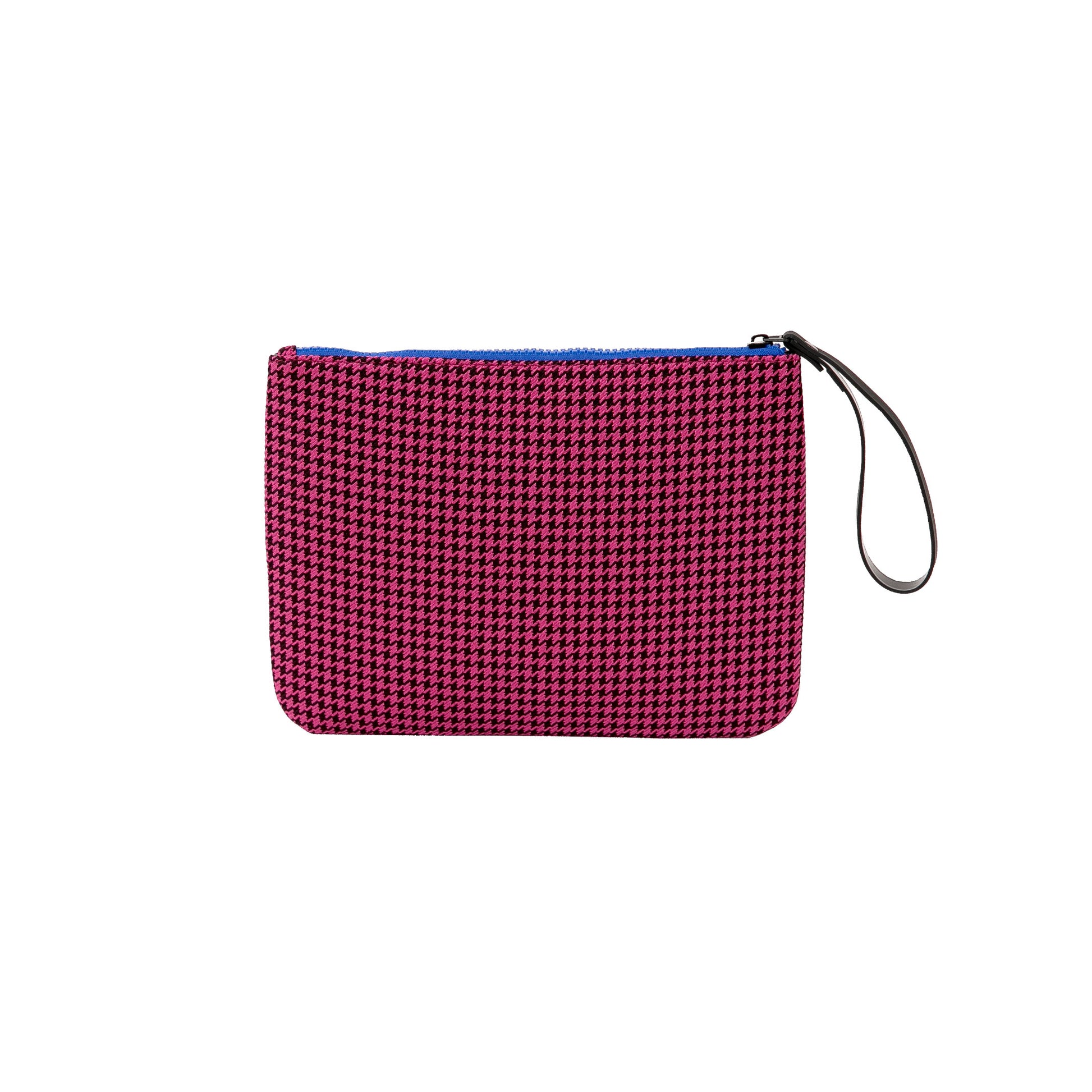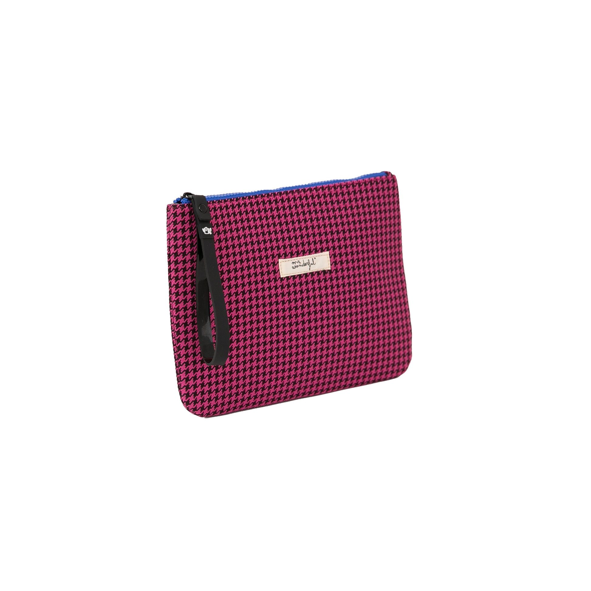 Portatodo realizado en poliéster con estampado de pata de gallo, que es tendencia en estos momentos. Su cierre de cremallera y el tirador de la misma son en un tono que contrasta con el del cuerpo del portatodo. Además, el tirador es lo suficientemente grande como para permitir llevarlo enganchado a la muñeca.