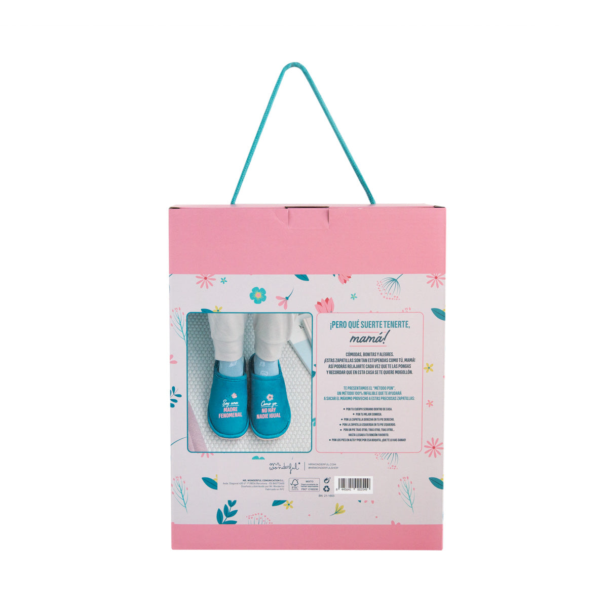 Zapatillas de estar por cada con un mensaje para las madres, dividido entre las dos zapatillas. Han sido realizadas en algodón y su suela es de PVC, antideslizante. Son unas zapatillas para madres mulliditas y muy cómodas. Disponibles en dos tallas: 36-38 y 39-41.