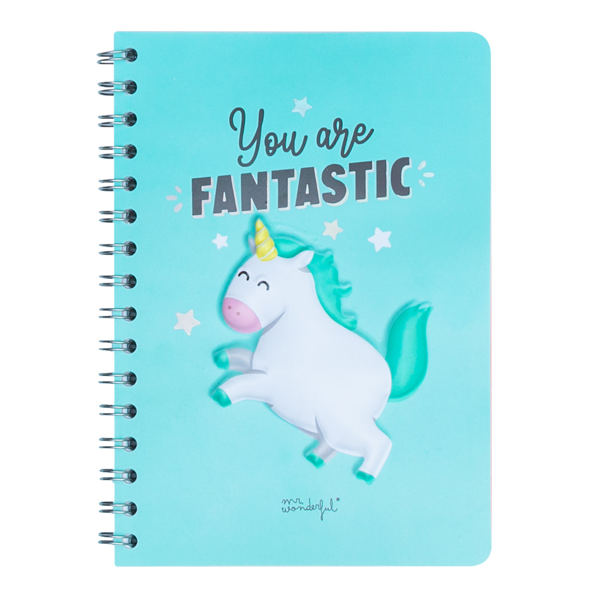 Caderno tamanho A5 com capa 3D com o unicórnio Mr. Wonderful. Inclui um detalhe pendurado numa das extremidades para um toque original. Possui certificação FSC, que garante que é feito com papel proveniente de florestas geridas de forma responsável.