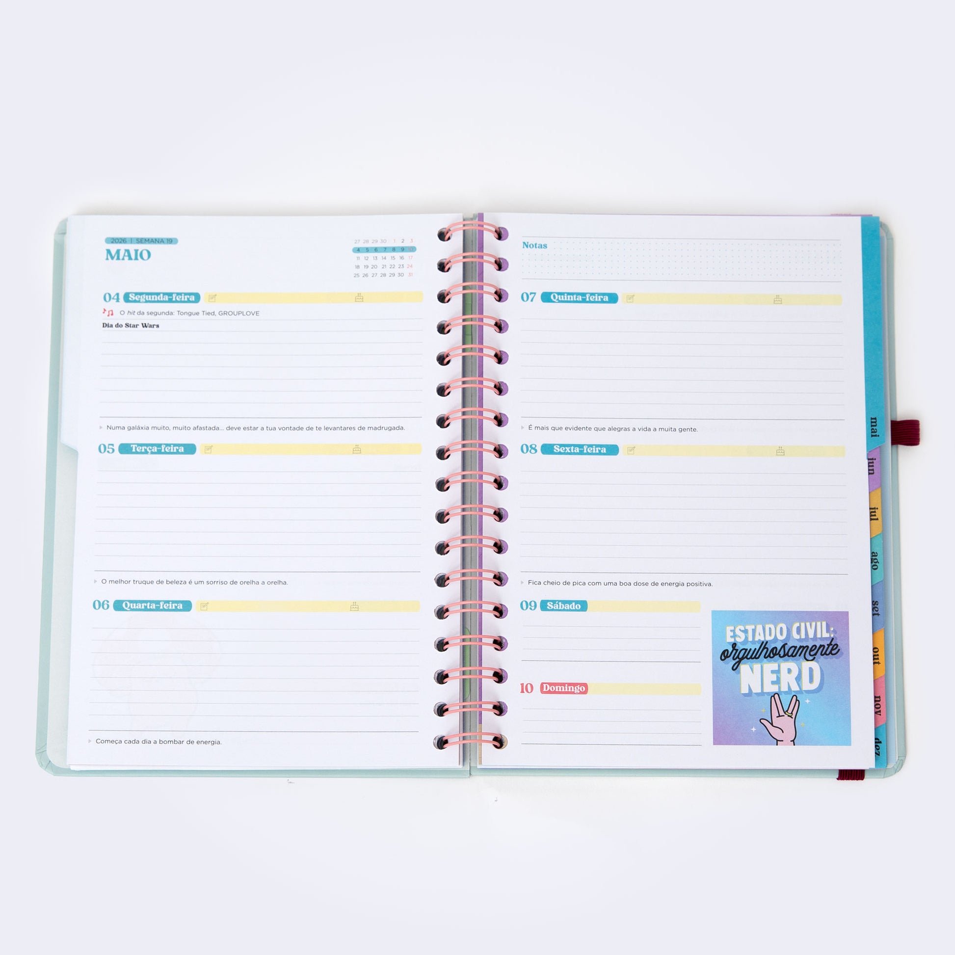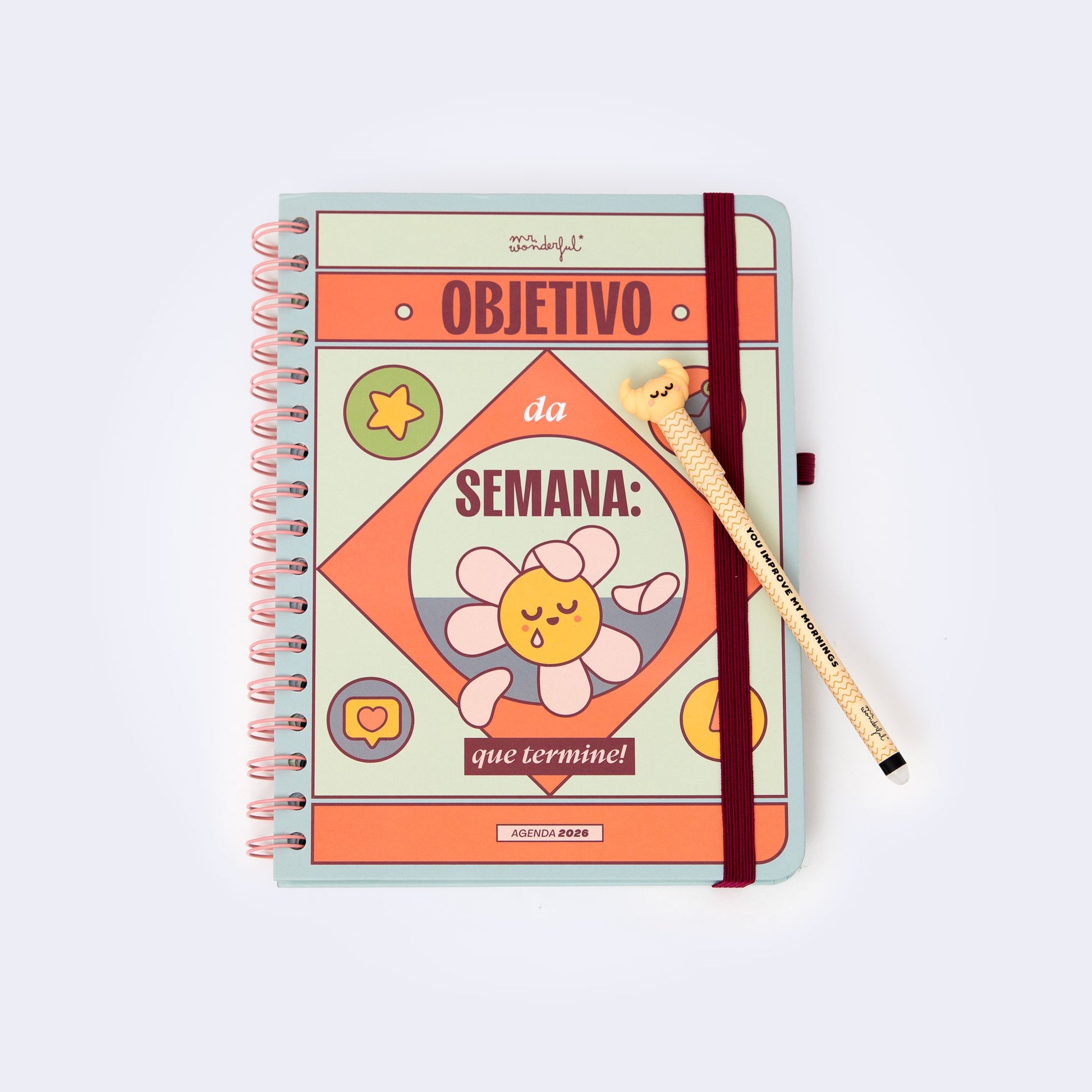 Agenda estilo Wonder da Mr. Wonderful, com organização semanal, vai de janeiro a dezembro de 2026. Esta agenda contém: