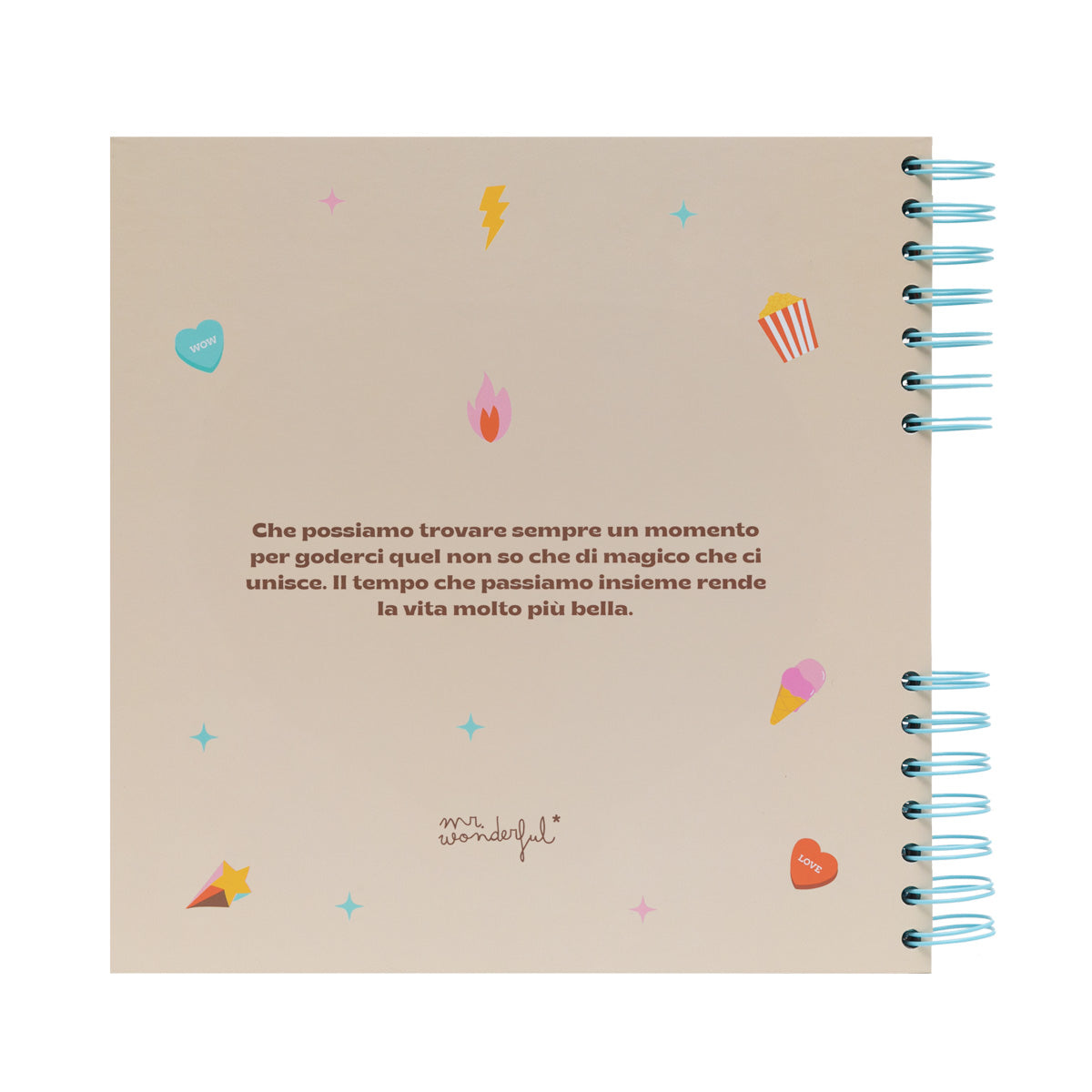 Álbum fotográfico sobre o tema do amor, com 64 páginas. Em 25 deles, um título de um pouco mais é fornecido com um índice do projeto de casal proposto. Il est recuvert d'une pastille d'encre to ralado qui, une fois grattee, révèle un projet surpresa para realisar em casal. Um dos projetos foi concluído, a página em questão e a página seguinte são ilustradas pelas fotos e/ou lembranças deste dia. Após 25 planos, o restante do espaço para outros seis planos para o casal, mas que não estão prontos para avançar (nas páginas, o espaço para o casal pode escrever o título do plano e explicar em que consiste). O álbum é composto por duas músicas de autocolantes. Possui certificação FSC, o que garante que sua fabricação é realizada com papel proveniente de florestas ambientalmente responsáveis.