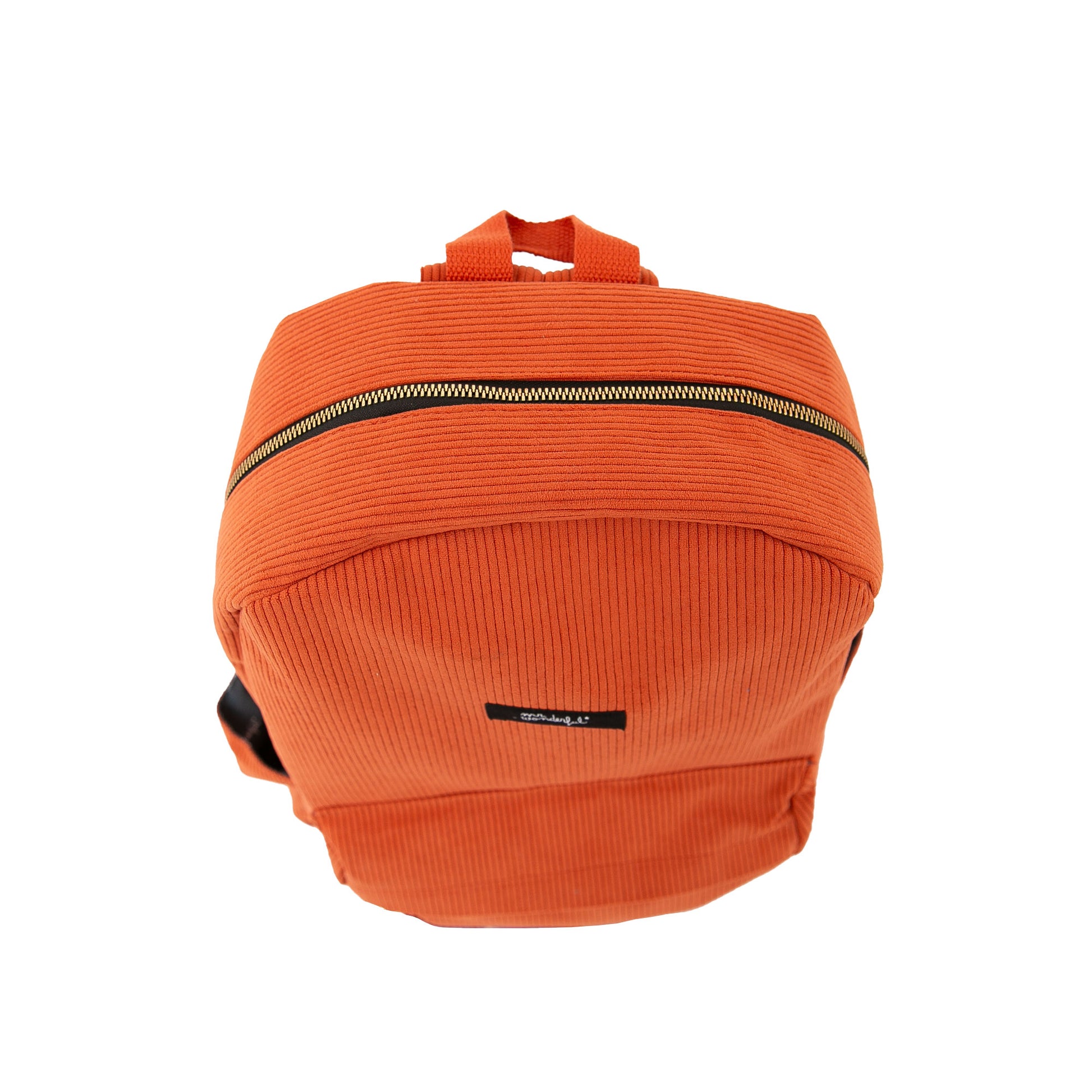 Mochila realizada en pana, con un patrón rectangular que es tendencia en estos momentos, así como el color de la misma. En su parte frontal cuenta con un bolsillo aparte, también rectangular, y con cierre de cremallera. La longitud de sus asas es adaptable y cuenta con un asa en su parte superior para agarrarla con facilidad.