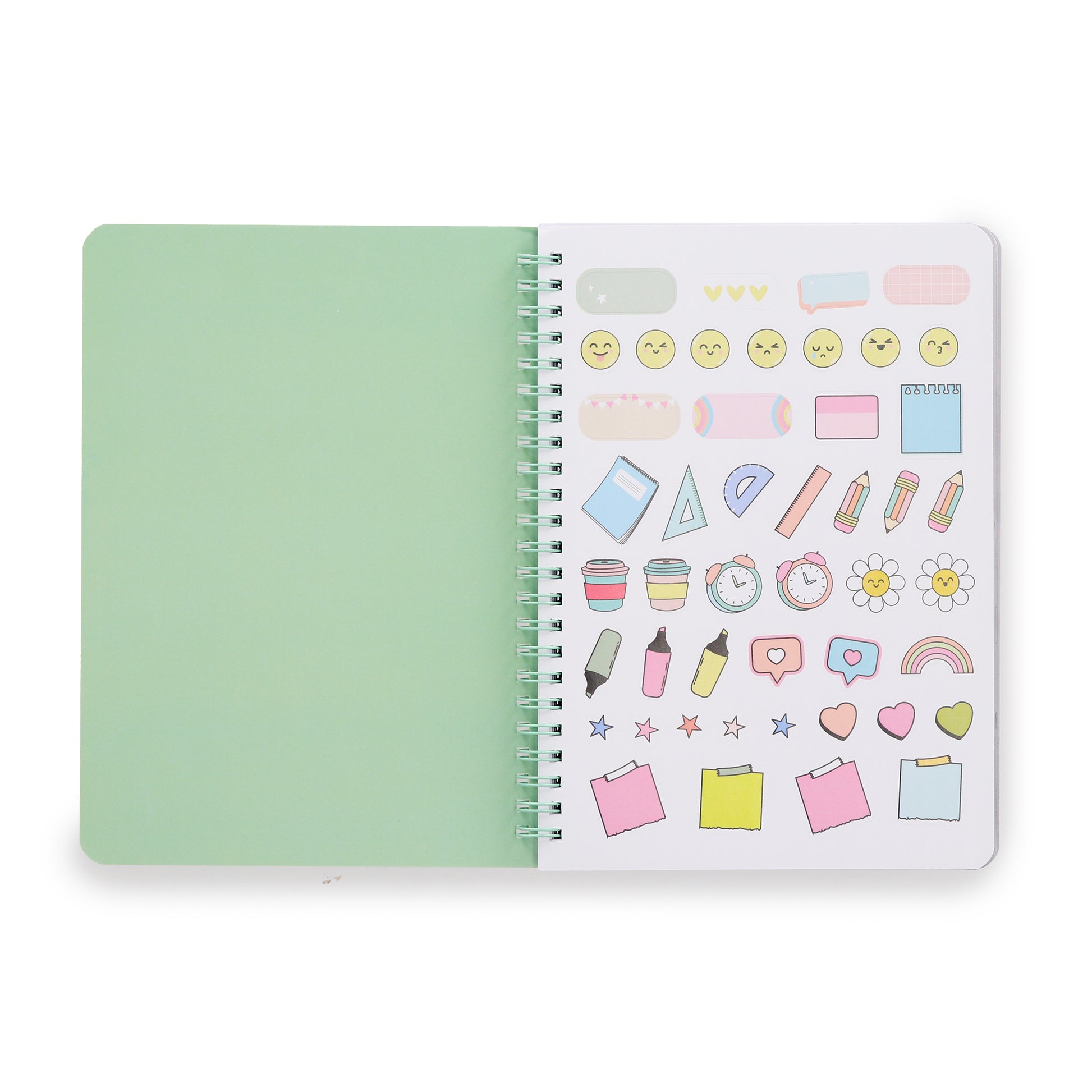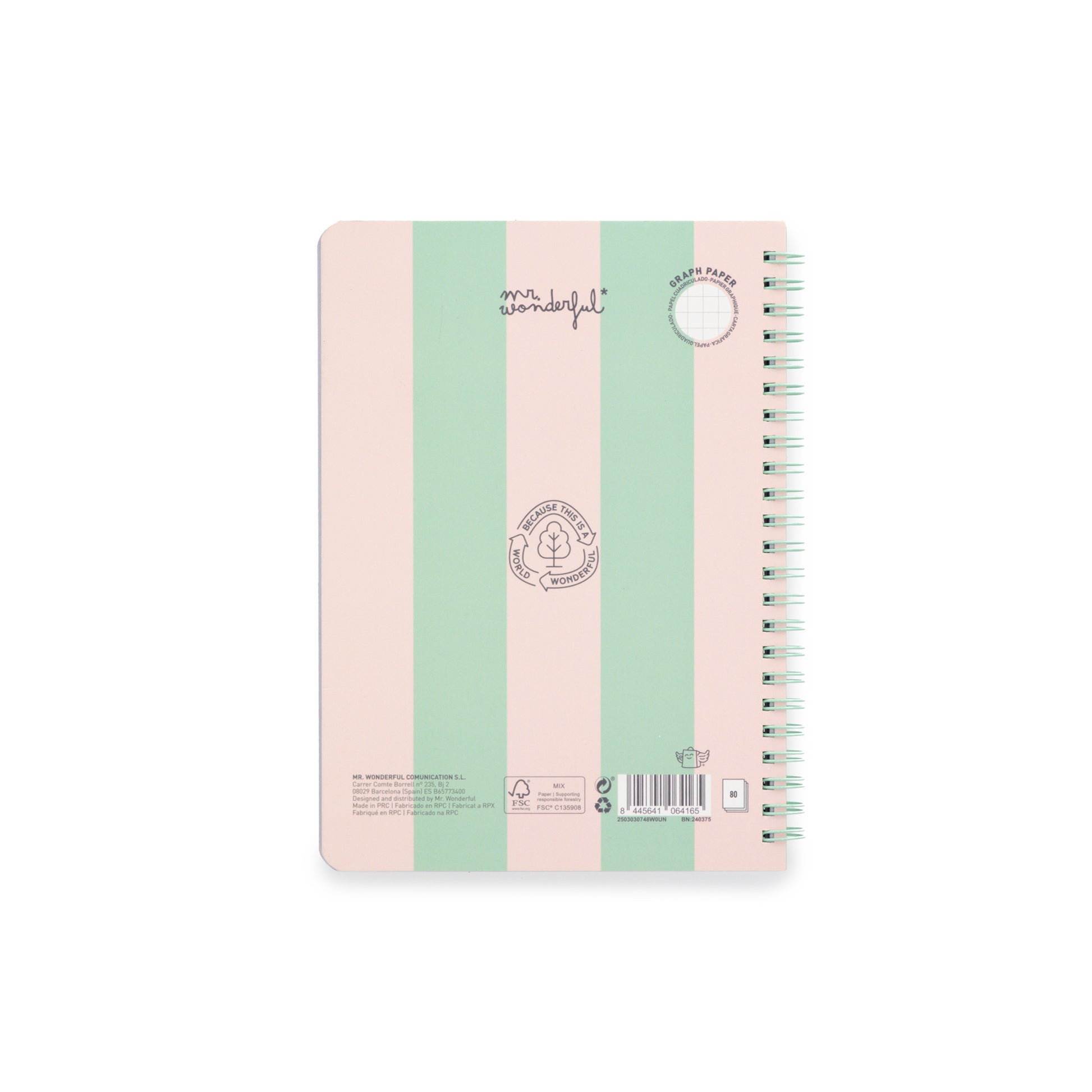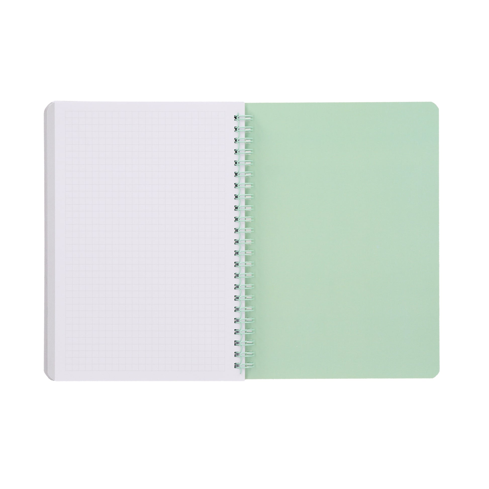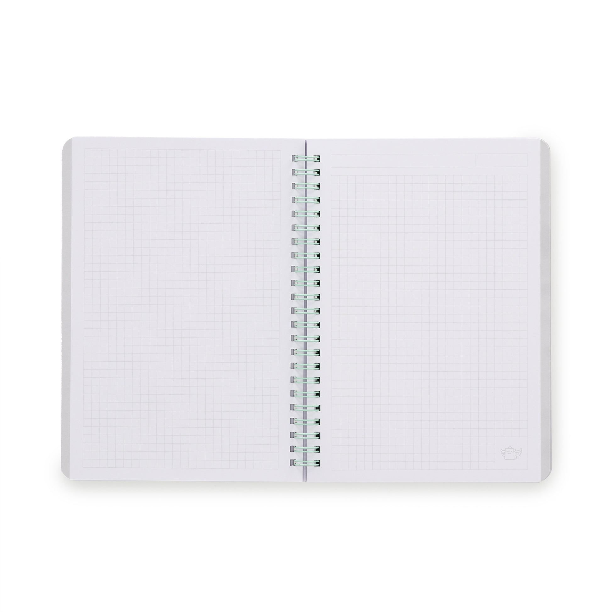 Cuaderno tamanho A5 com encadernação espiral e capa dura. Com 160 páginas quadriculadas de 90gsm, com certificação FSC, que garante que o papel provém de florestas manejadas de forma responsável.