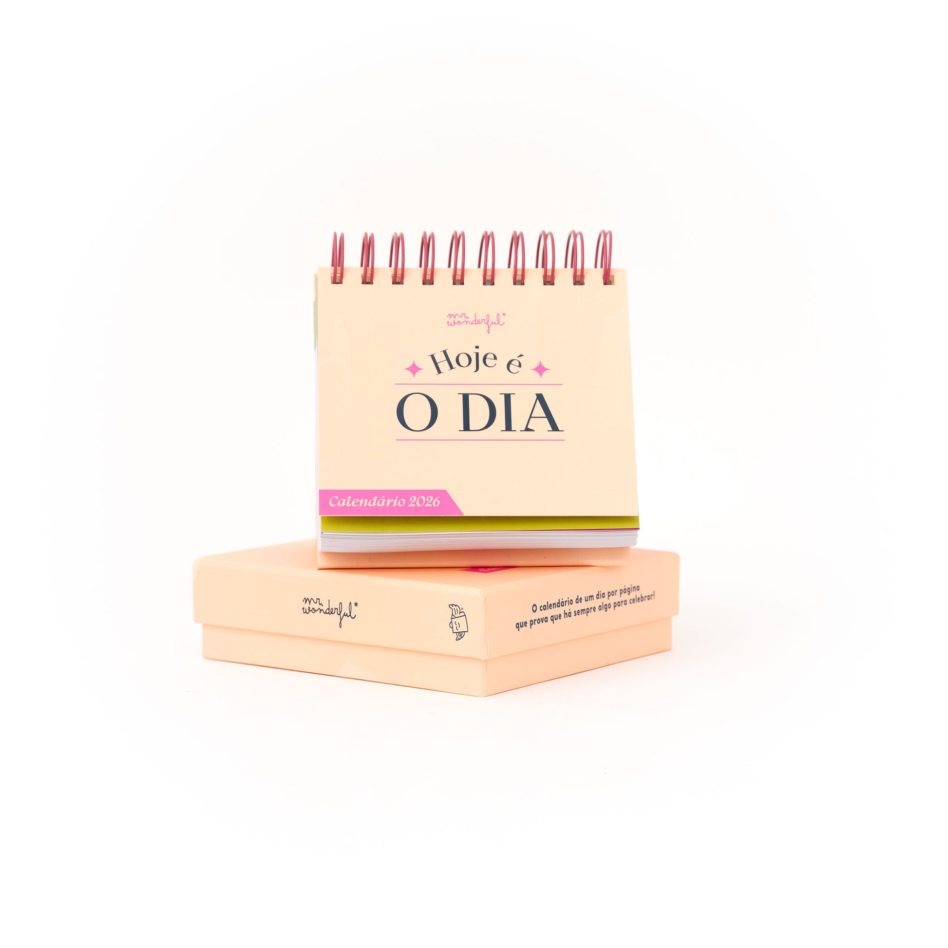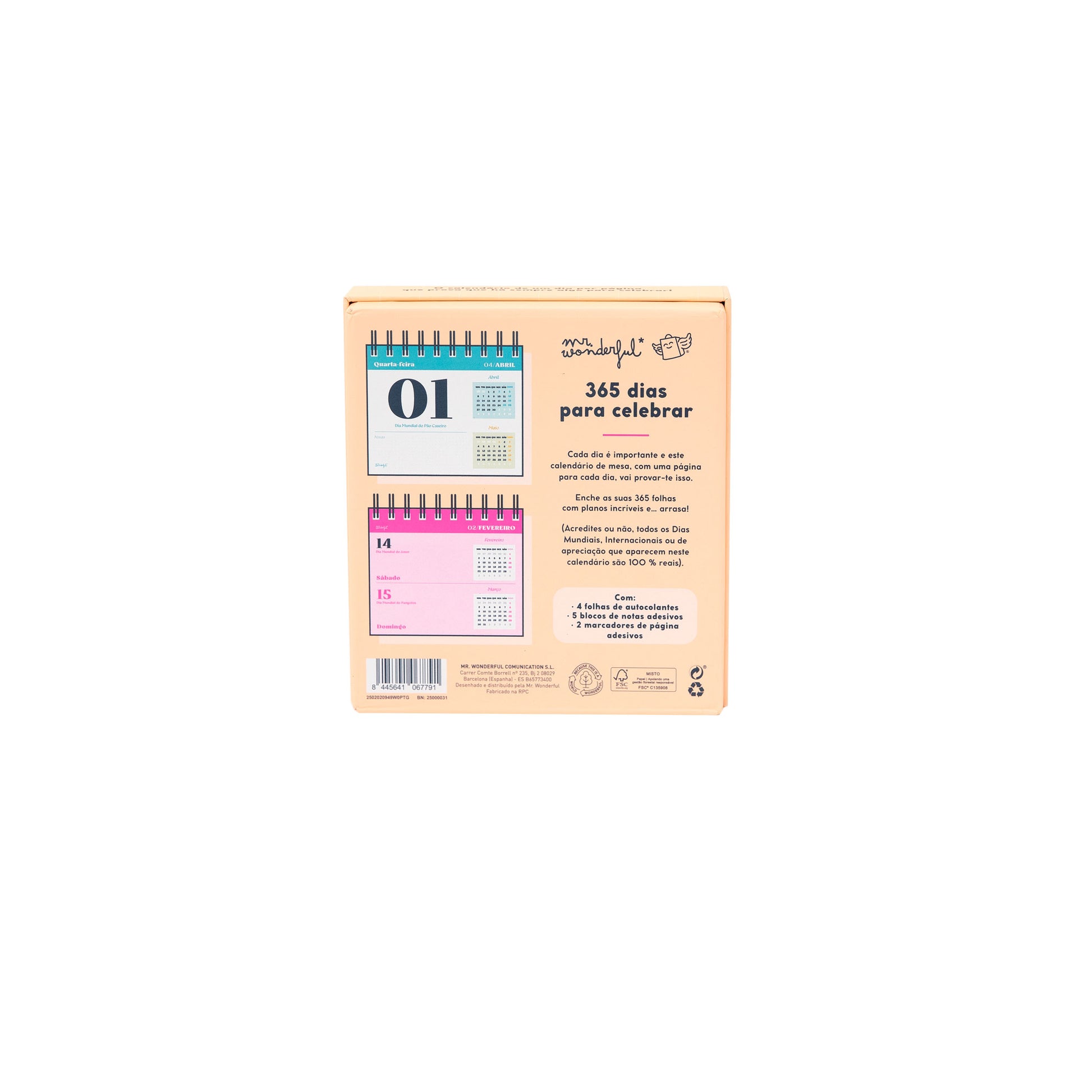 Calendário de mesa com uma página por dia para o ano inteiro, pensado para que os primeiros 6 meses não tenham uma direção definida e, para verificar o mês seguinte, basta virá-lo ao contrário para ver os próximos 6 meses. Em cada dia, encontrará um Dia Mundial, Internacional ou Surpresa de Apreciação.