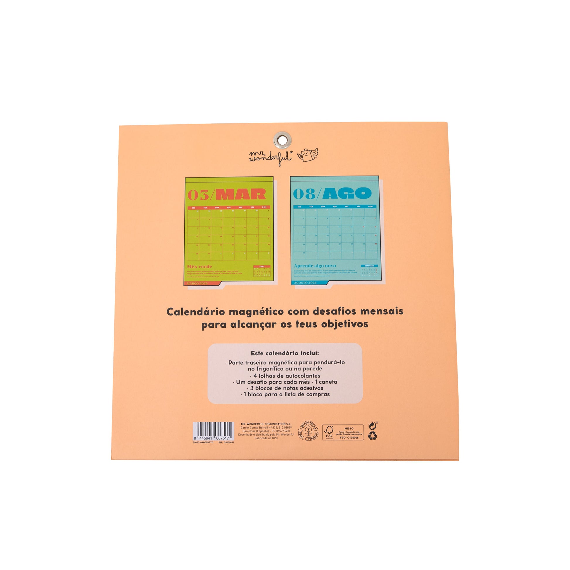Calendário de parede ou de frigorífico, com parte traseira magnética que permite pendurá-lo na porta do frigorífico ou na parede. Com um desafio para cada mês do ano, inclui ainda 4 folhas de autocolantes, 1 recipiente, 3 blocos de notas autocolantes e 1 bloco para lista de compras.