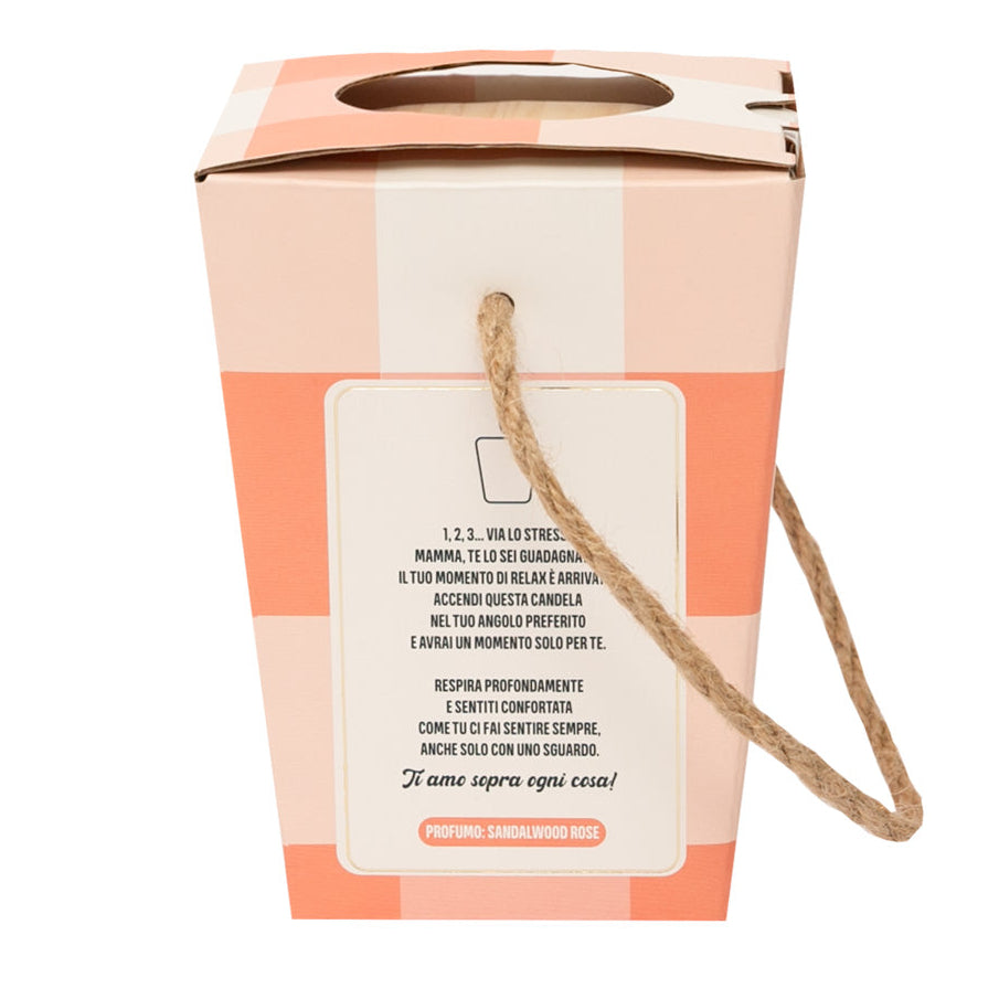 A vela perfumada é feita de cera vegetal e apresentada num recipiente de vidro, no qual está estampada uma frase dedicada a todas as mães. Inclui cuperchio em legno. Profumo: rosa de sândalo.