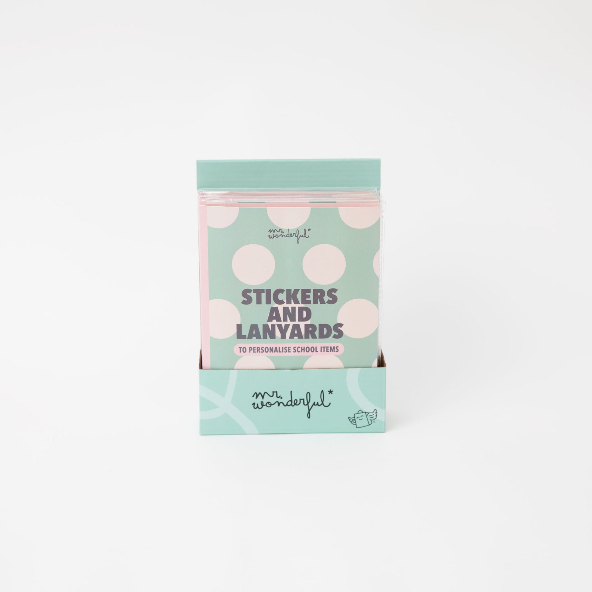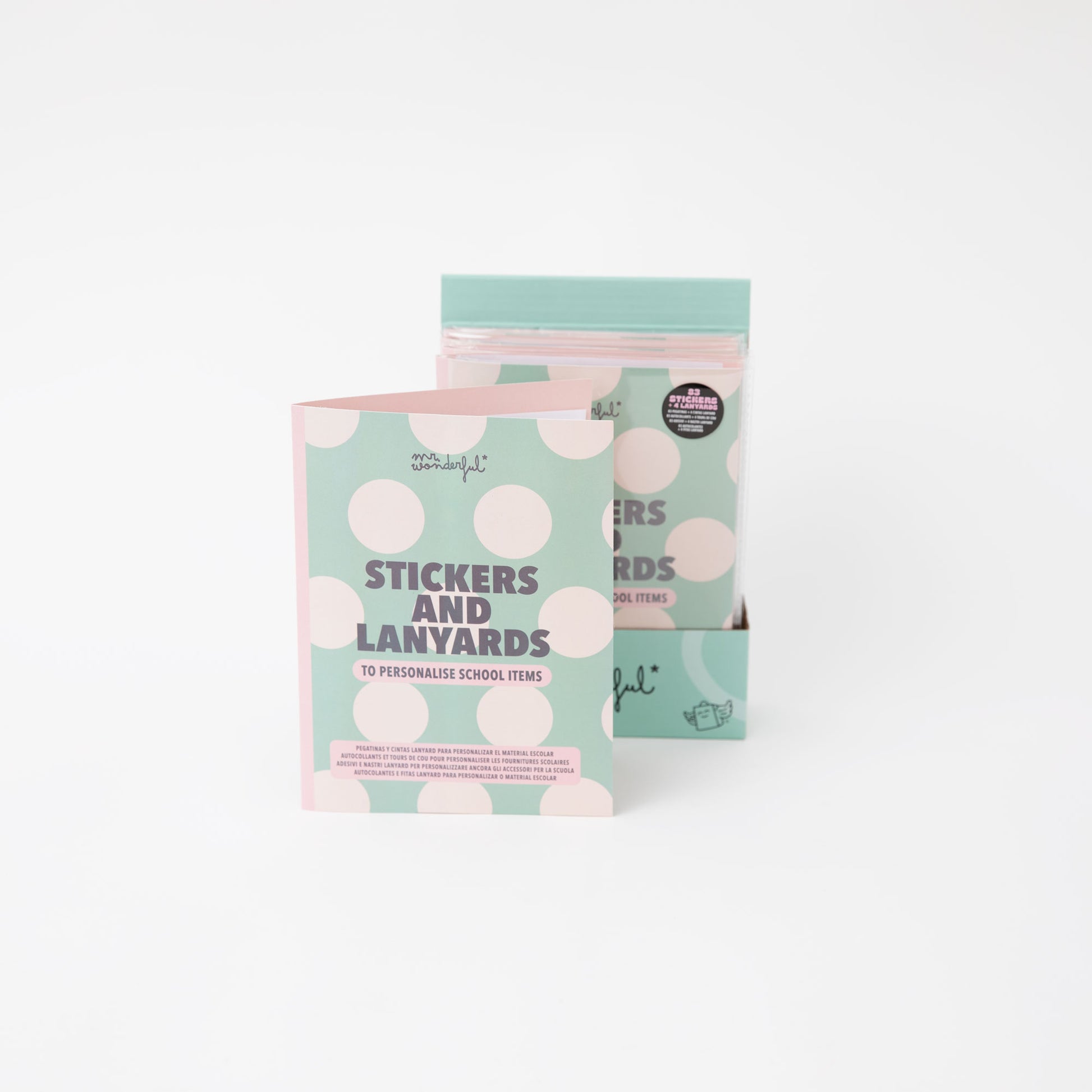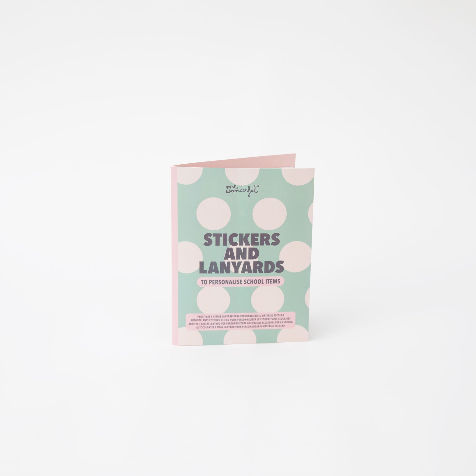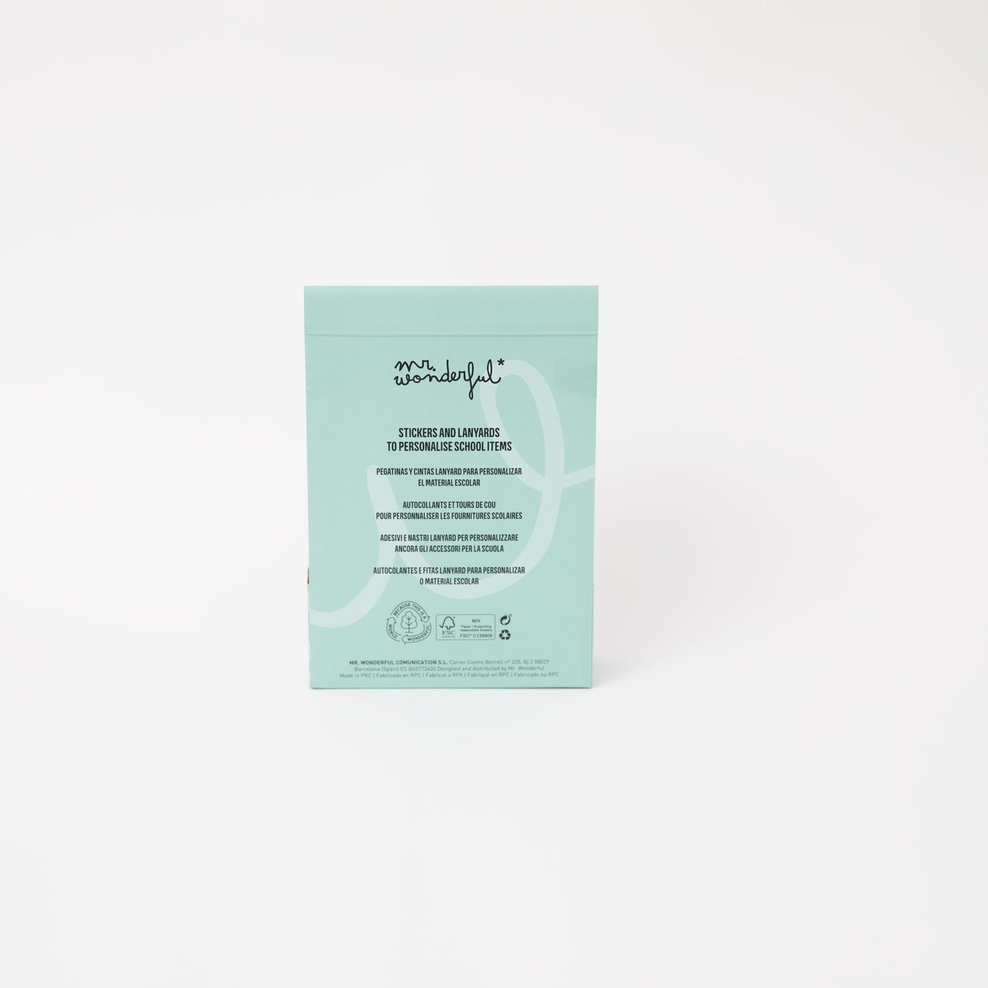 Conjunto de adesivos e fitas lanyard para personalizar o material escolar e mantê-lo sempre à mão. Contém 83 adesivos de vários tamanhos, 2 fitas lanyard de PU e 2 fitas lanyard de tecido.