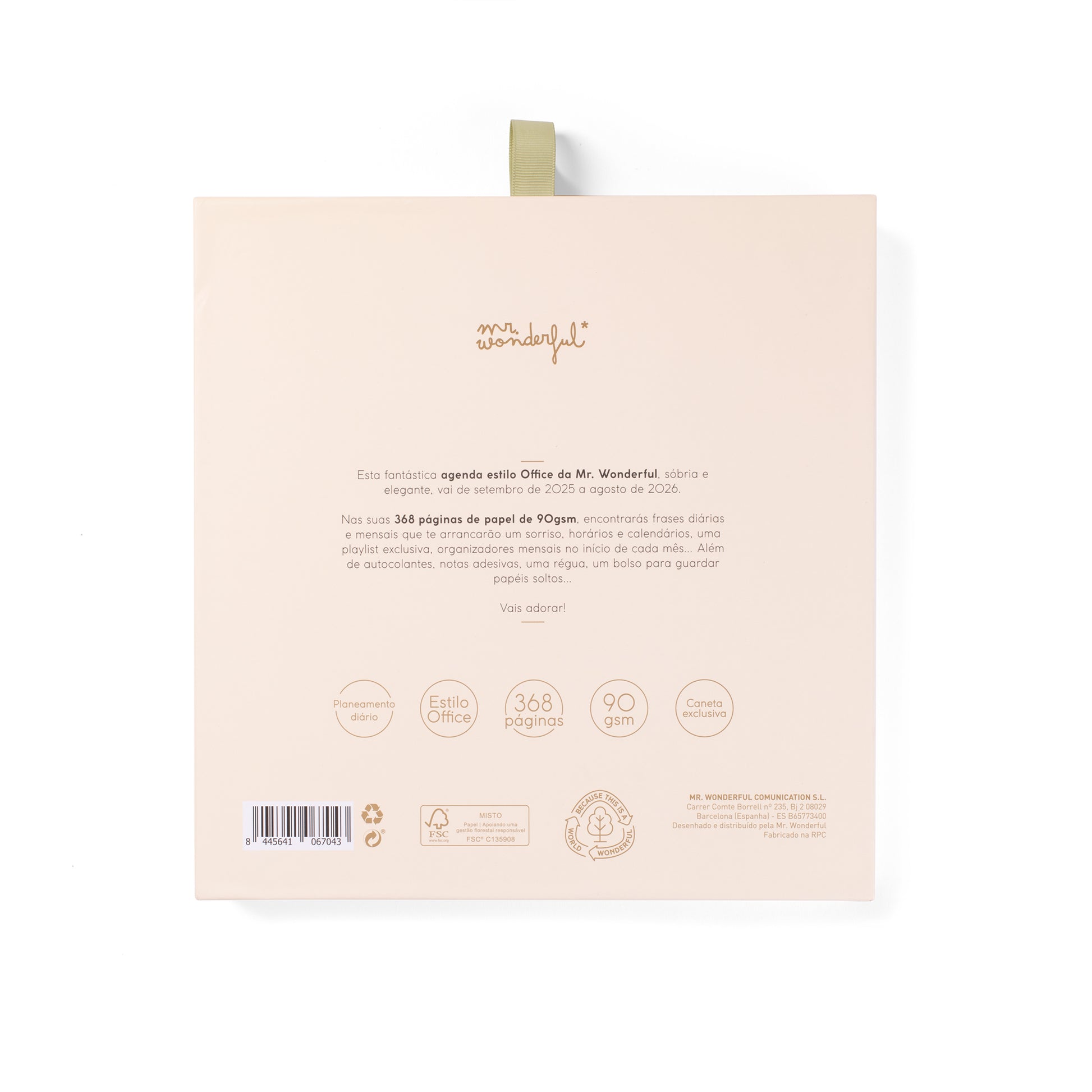 Conjunto apresentado numa bonita caixa premium composta por um recipiente de alta qualidade, estrutura metálica e com as mesmas mensagens da agenda estilo "O Escritório do Sr. Maravilhoso" que a acompanha. Este estilo de design, que já apresentámos em edições anteriores, é um pouco mais sóbrio e discreto do que o nosso estilo clássico, sendo perfeito para um público um pouco mais maduro. Com organização diária, a agenda decorre desde o final de setembro de 2025 até ao final de agosto de 2026 e inclui: