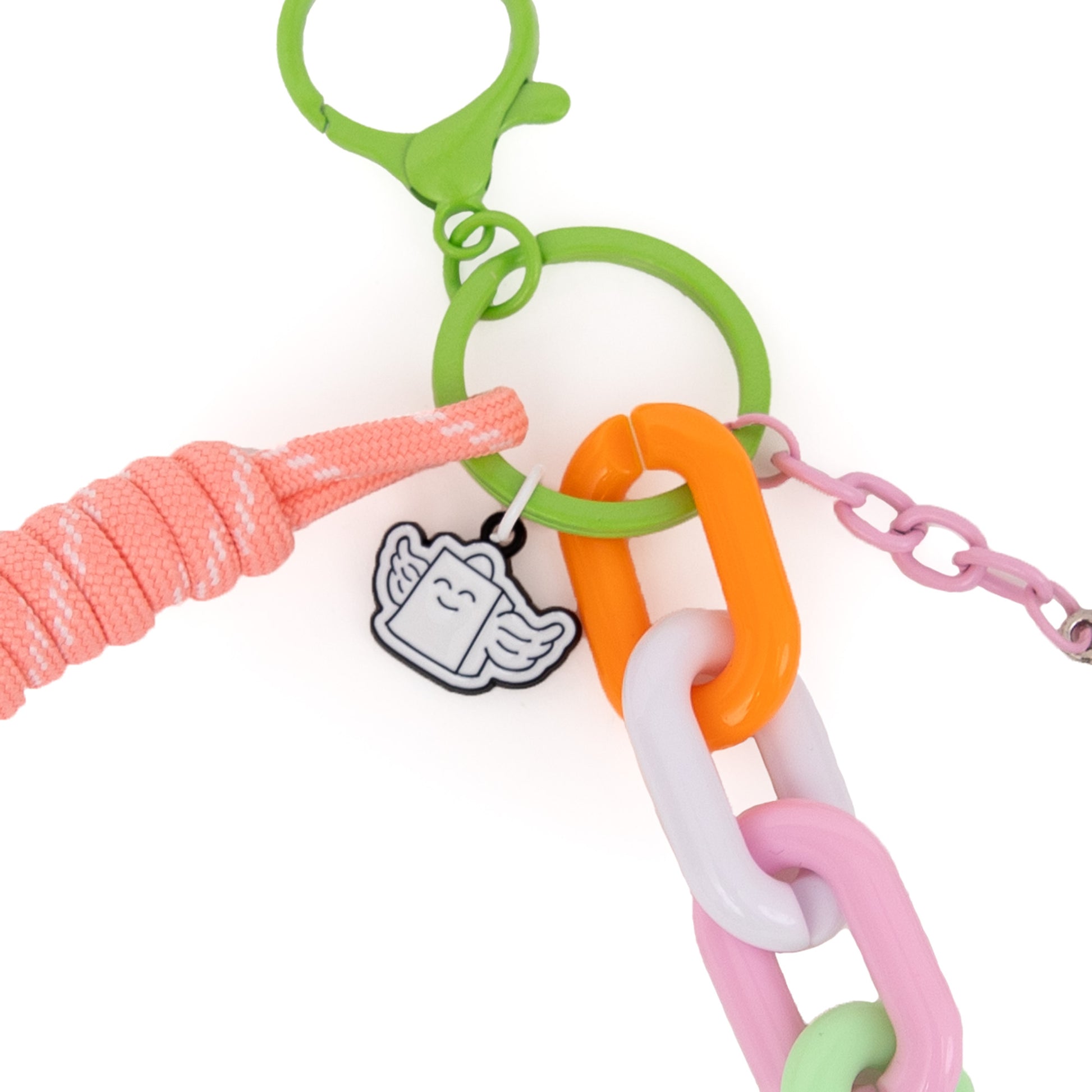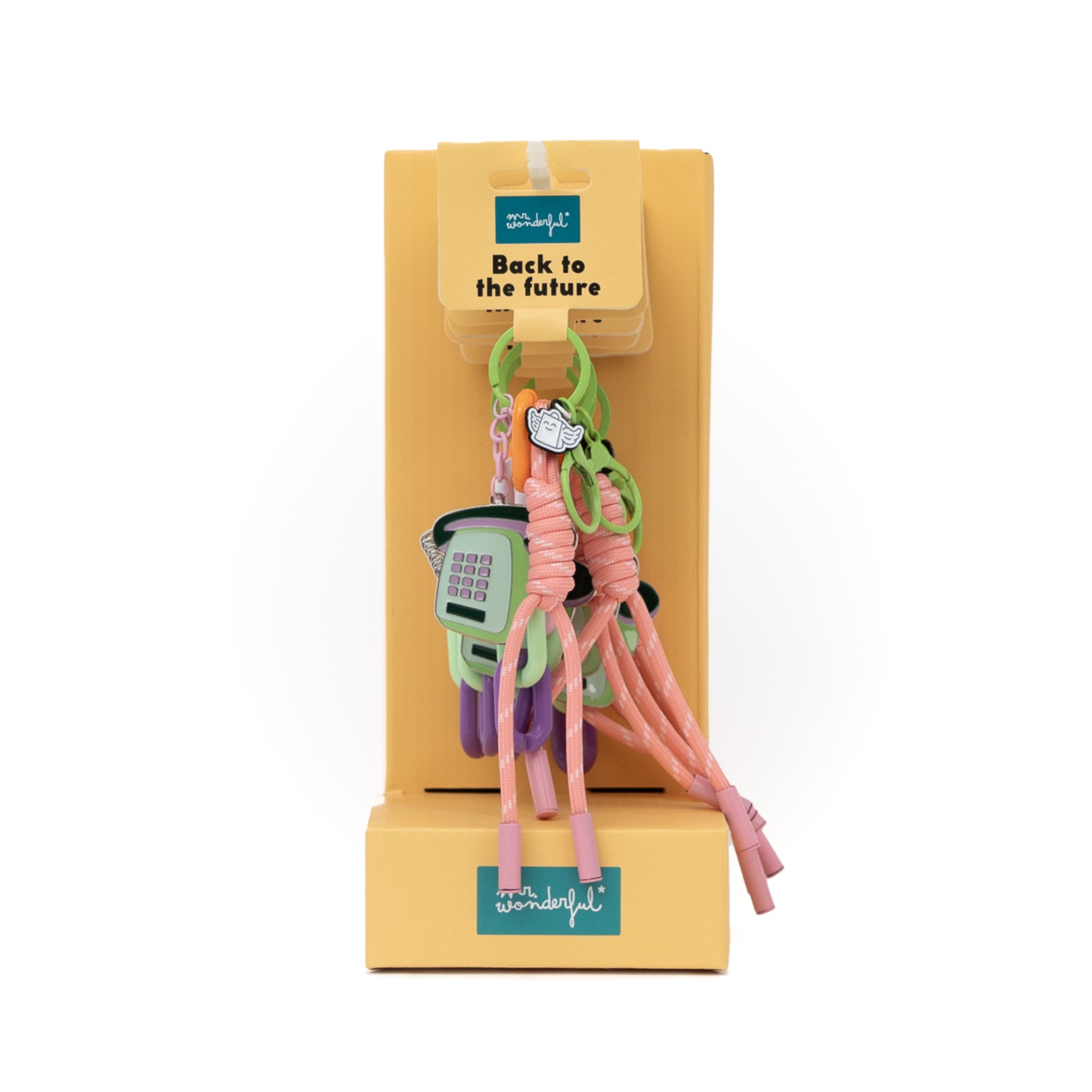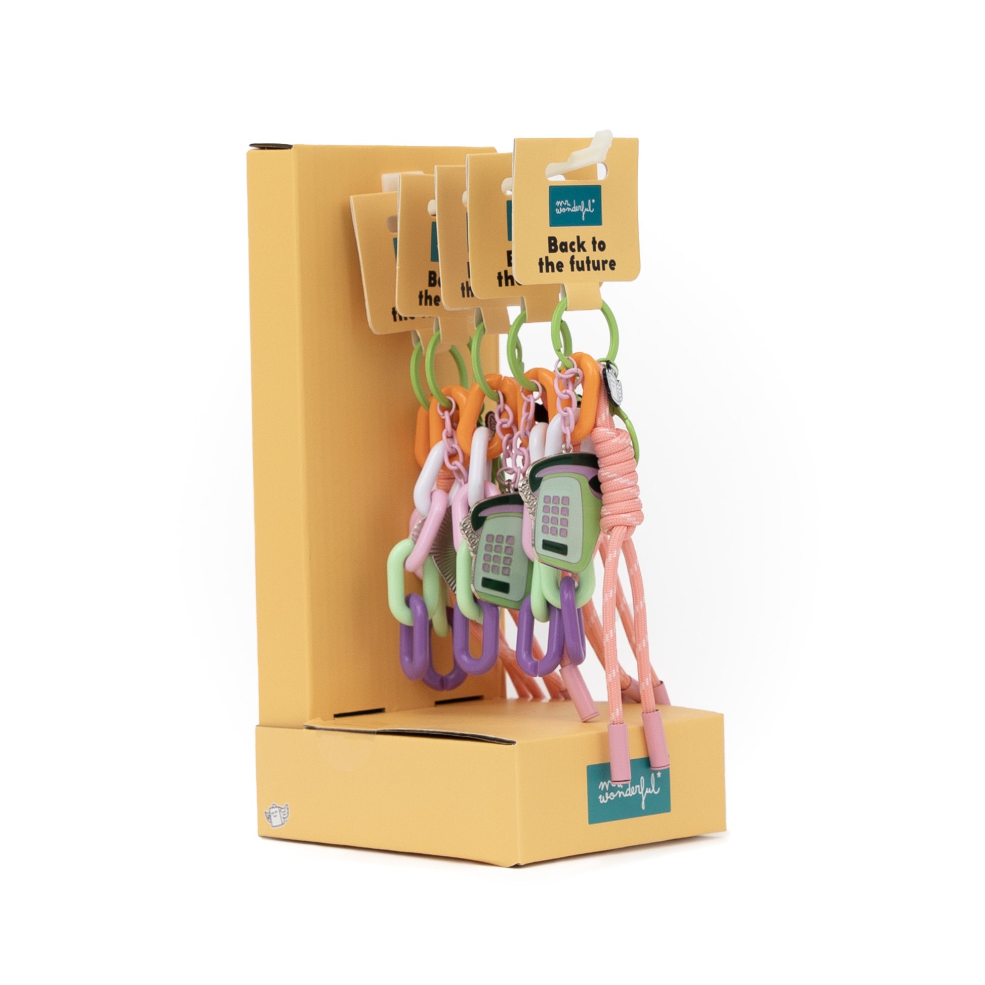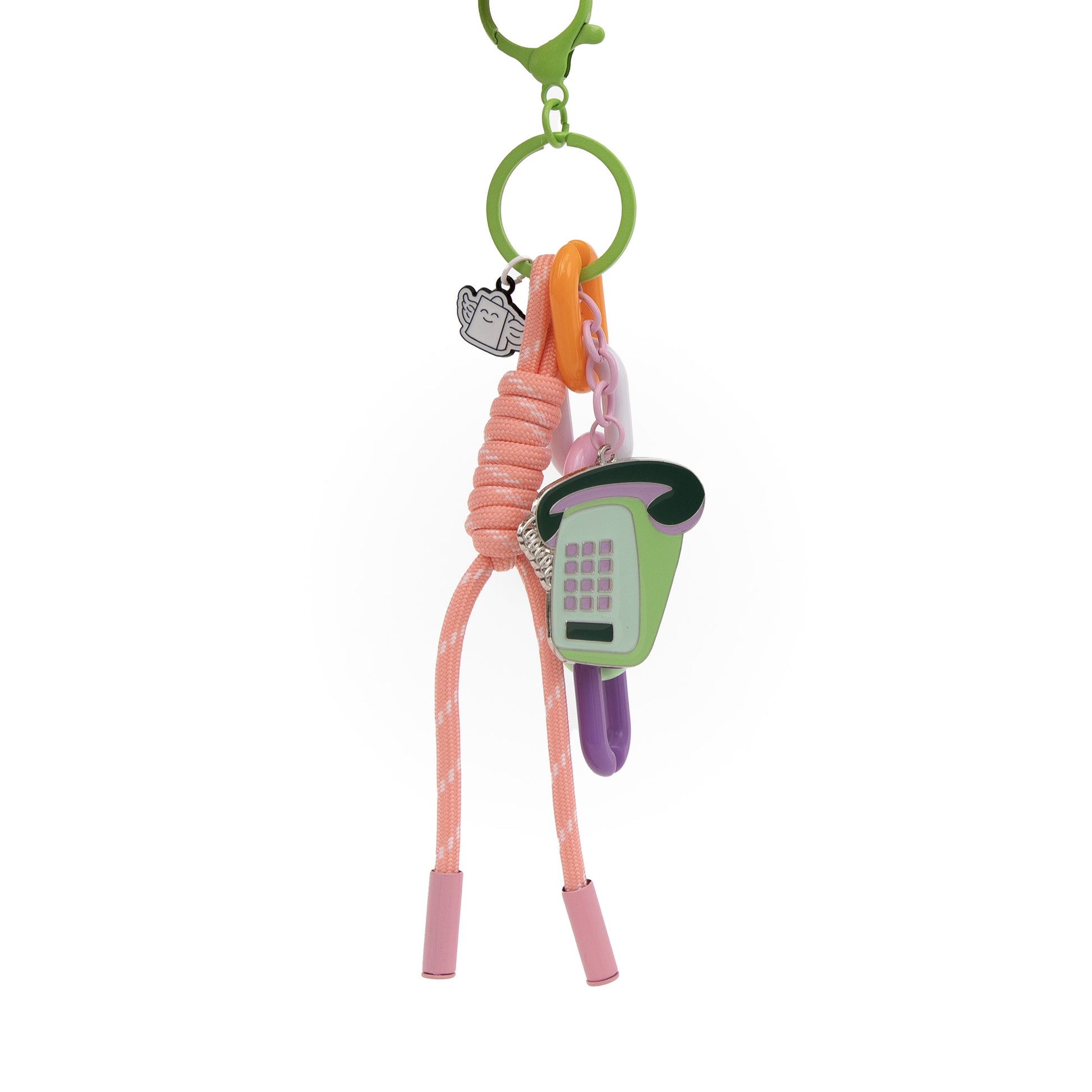 Decoración colgante para enganchar a bolsos o mochilas, dándoles un toque actual. La pieza de enganche es de estilo mosquetón y cuenta con un bonito teléfono vintage de metacrilato como decoración.