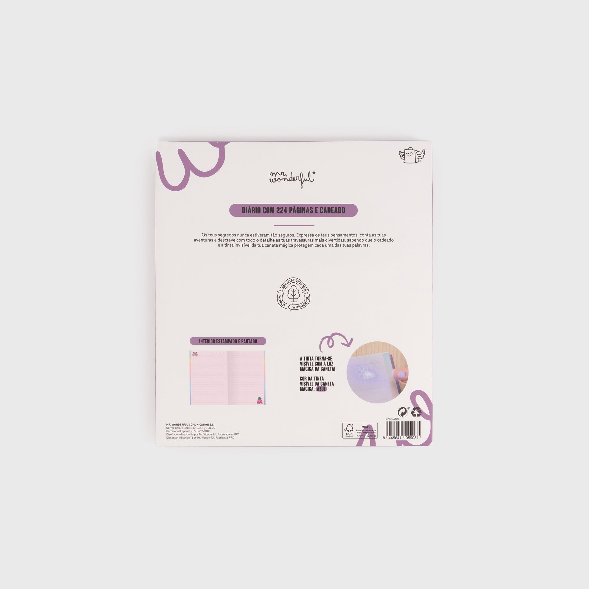 Diário pessoal com 224 páginas pautadas, carimbadas e datadas, com cadeado e chave (inclui chave extra). Além disso, inclui um recipiente com tinta azul normal de um lado e tinta "mágica" do outro: a tinta é invisível aos olhos e é iluminada pela luz incorporada no próprio recipiente.