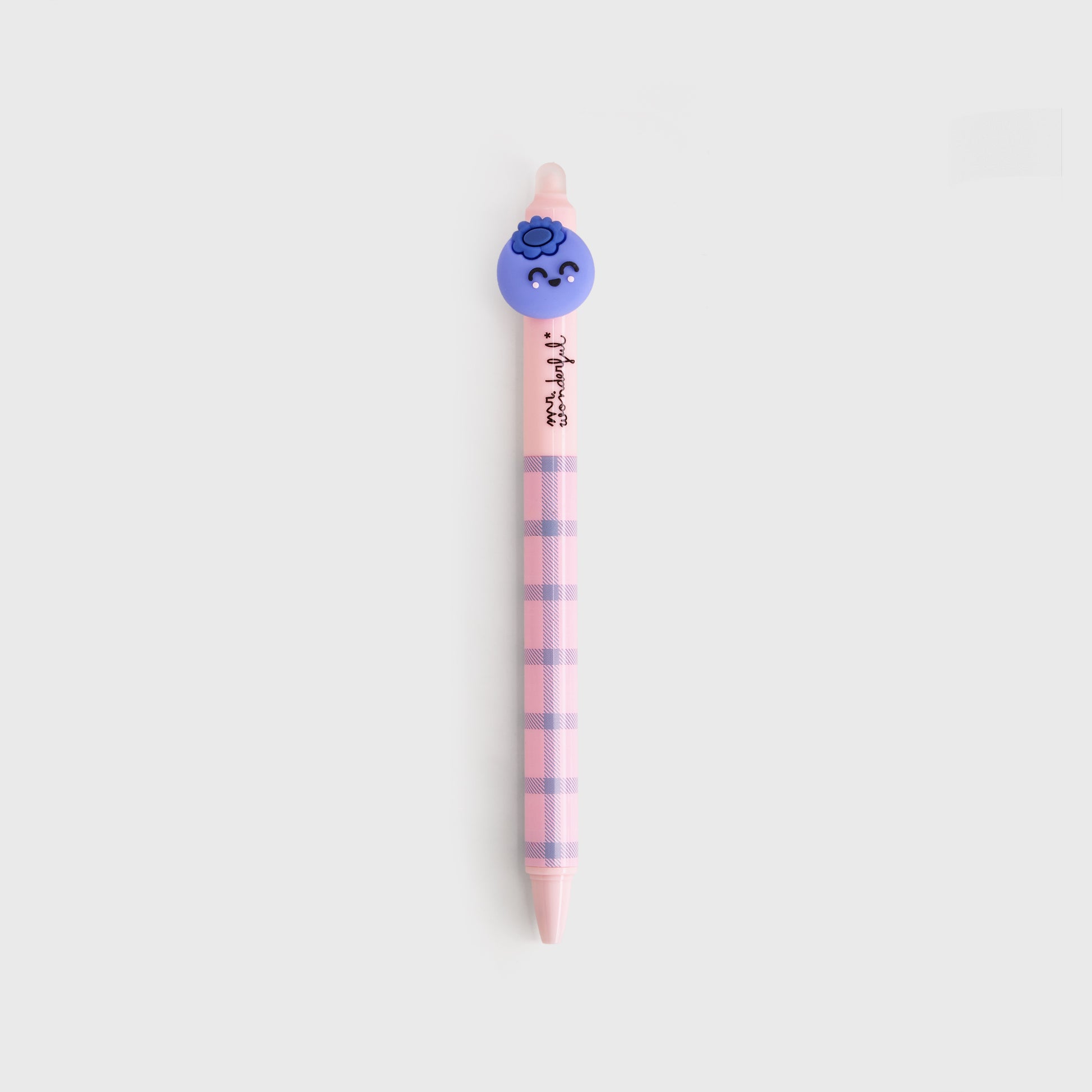 Caneta apagável com um mirtilo do Sr. Maravilhoso na ponta. Cor da tinta: azul.