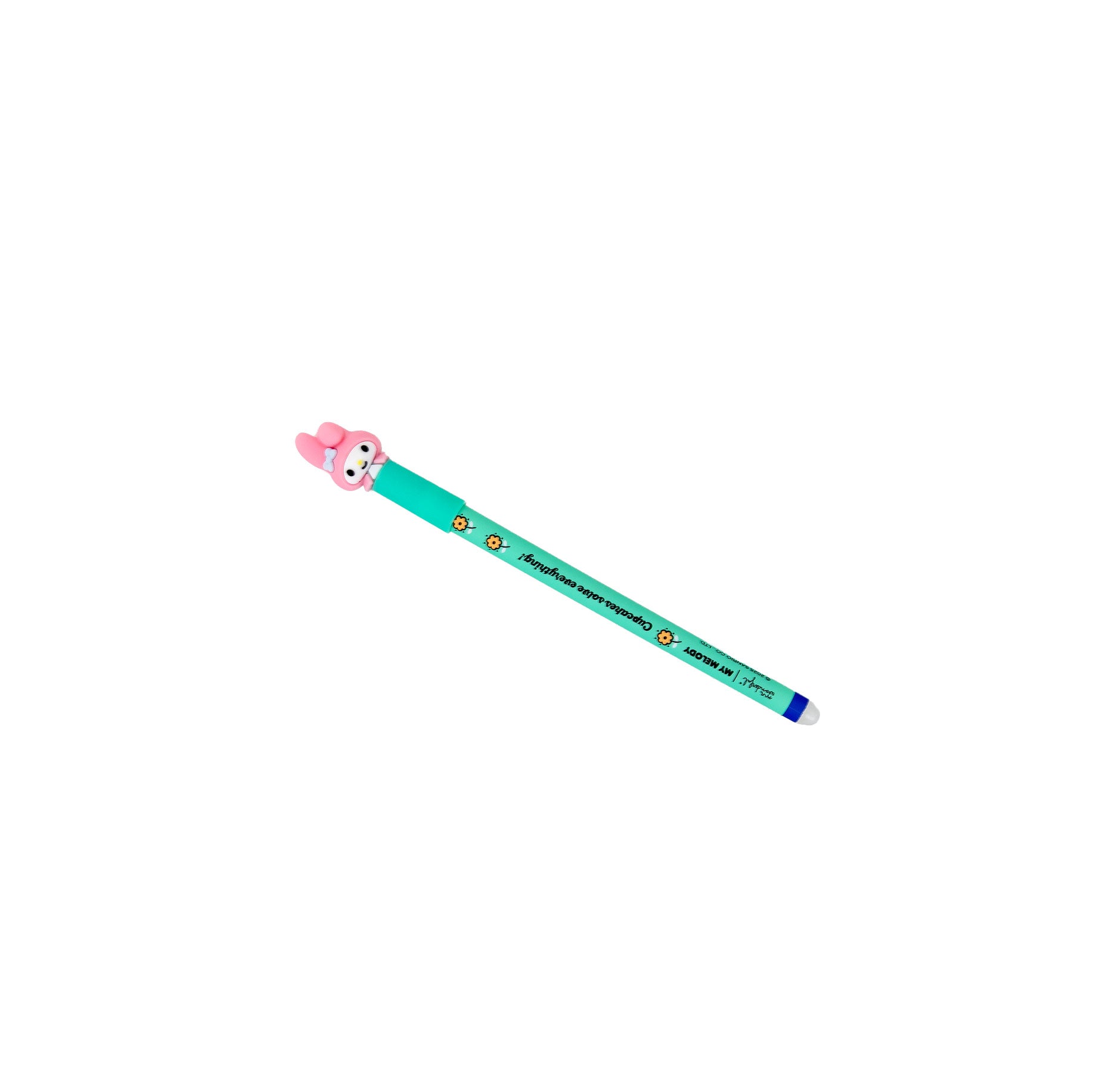Boli con tinta borrable de color azul y My Melody, la dulce amiga de Hello Kitty, en uno de sus extremos. Mensaje del bolígrafo: