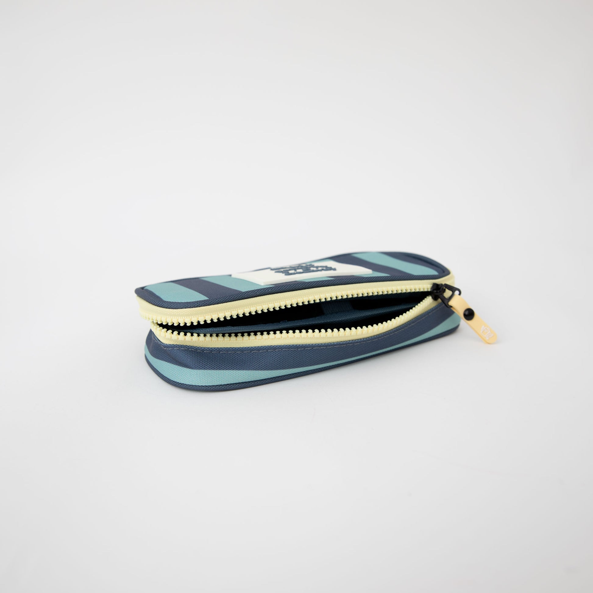 Estojo feito de rPET, um material 100% reciclável obtido a partir da reciclagem de garrafas plásticas. Com fechamento em zíper.