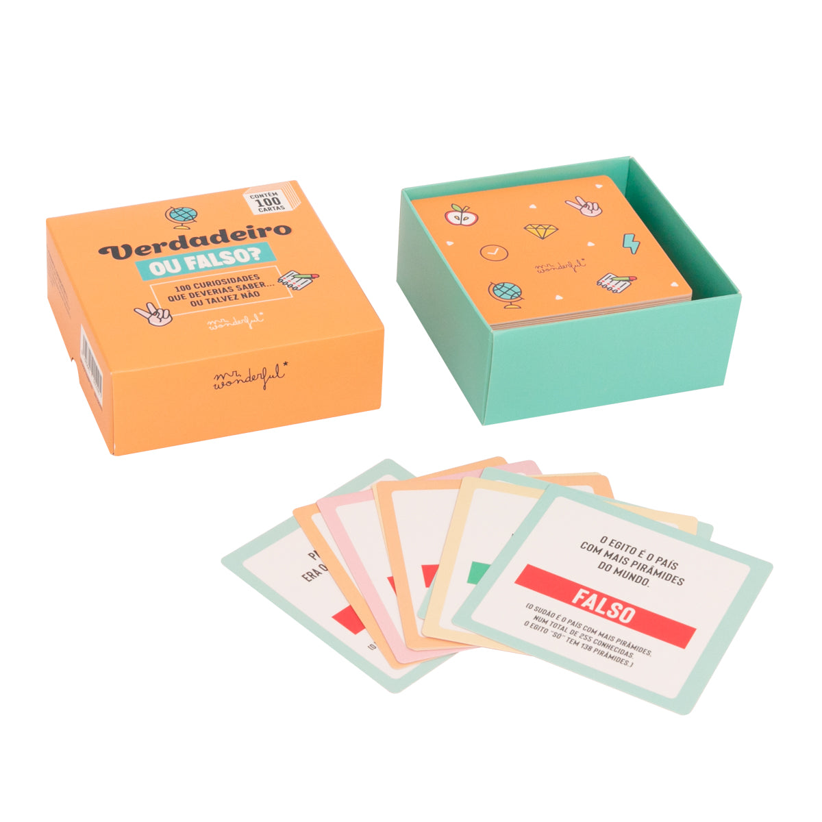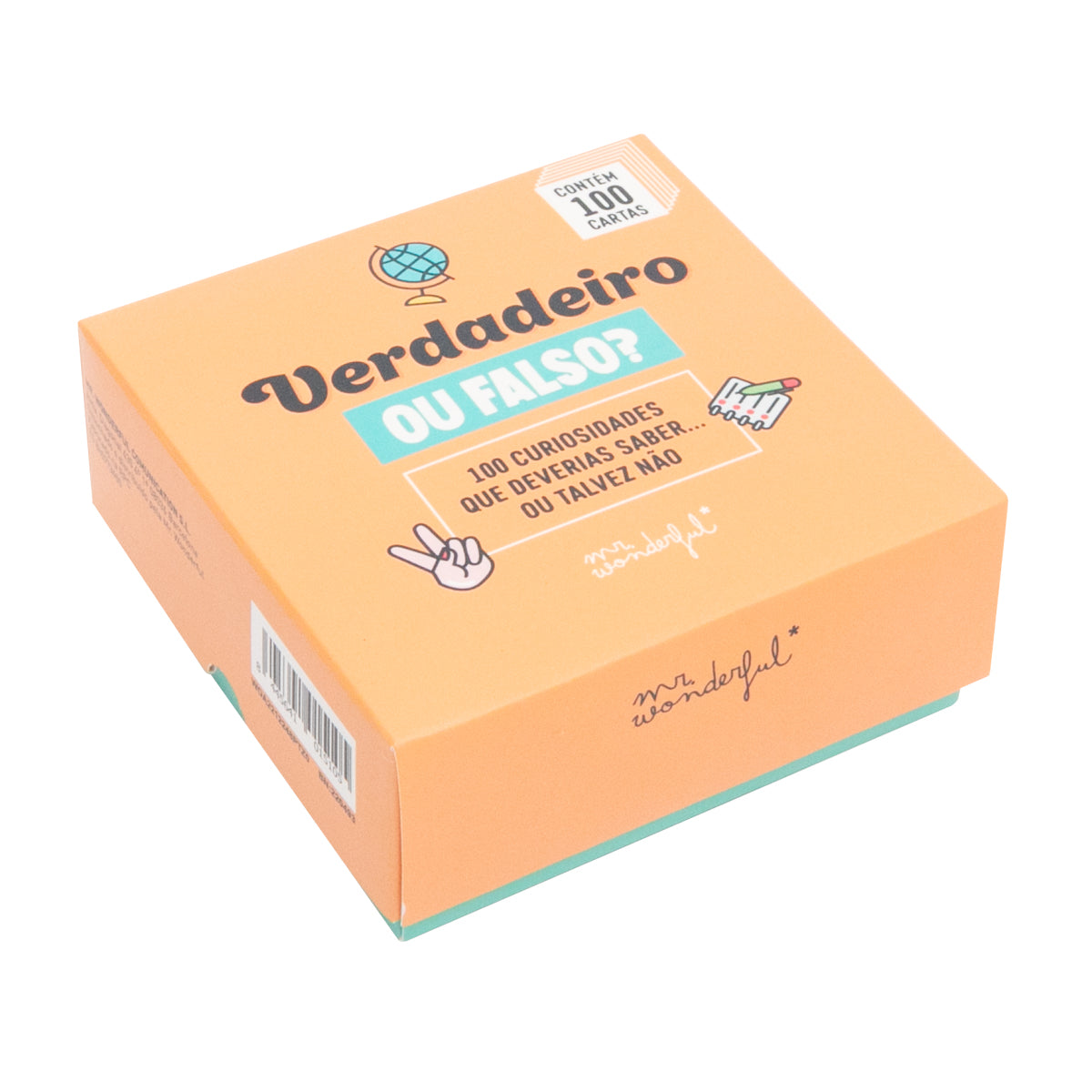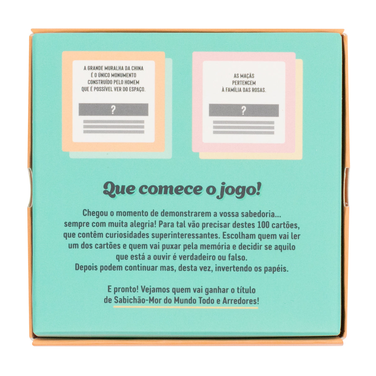 Jogo de cartas ideal para jogar com amigos ou família. É composto por 100 cartas e em cada uma delas encontramos uma afirmação que pode ser verdadeira ou falsa, e o jogo consiste em adivinhar a si mesmo. As curiosidades abordam o corpo humano, a natureza, a história... com temas muito variados e divertidos.