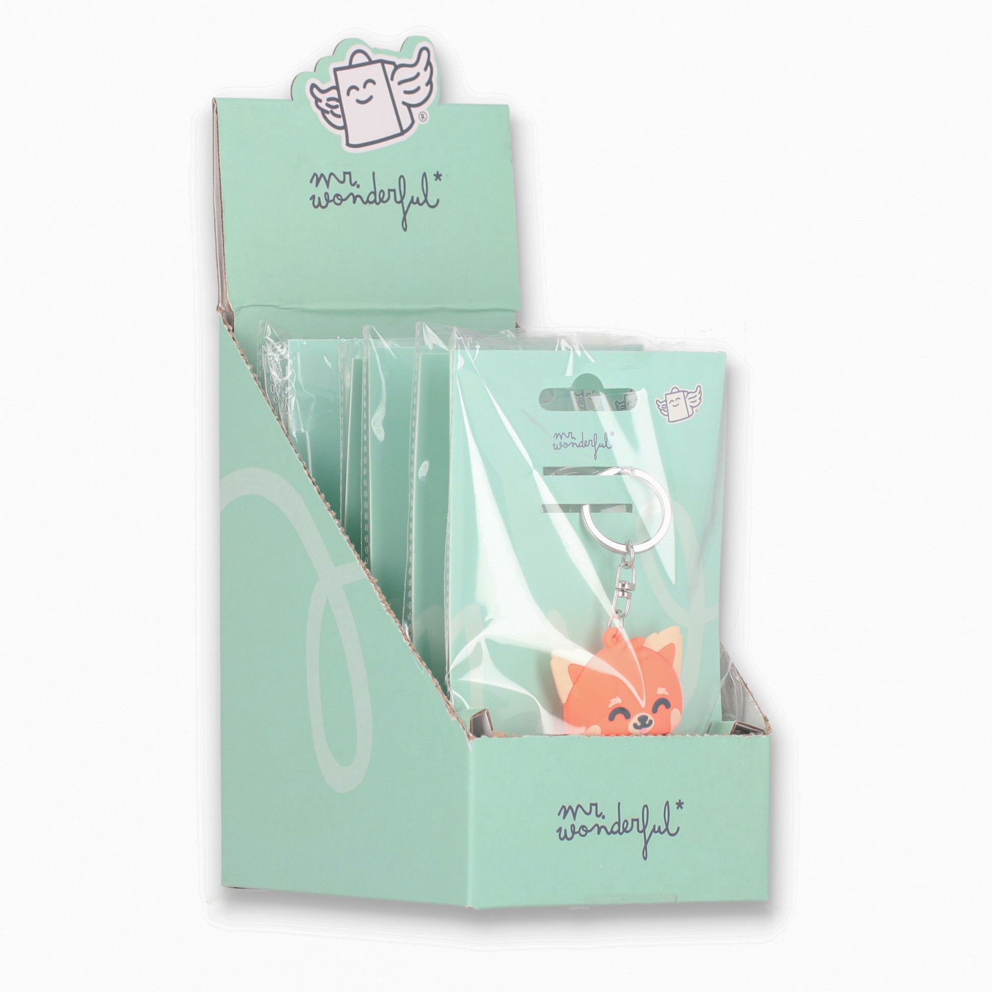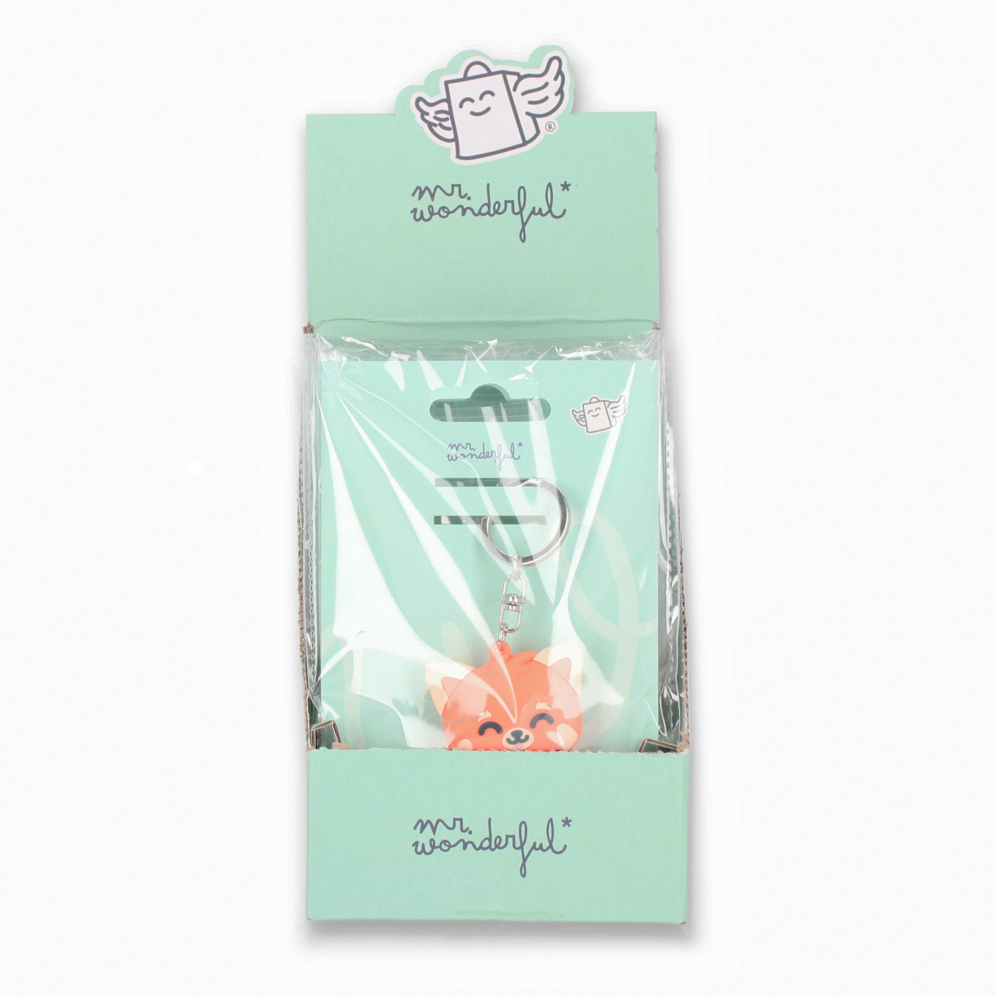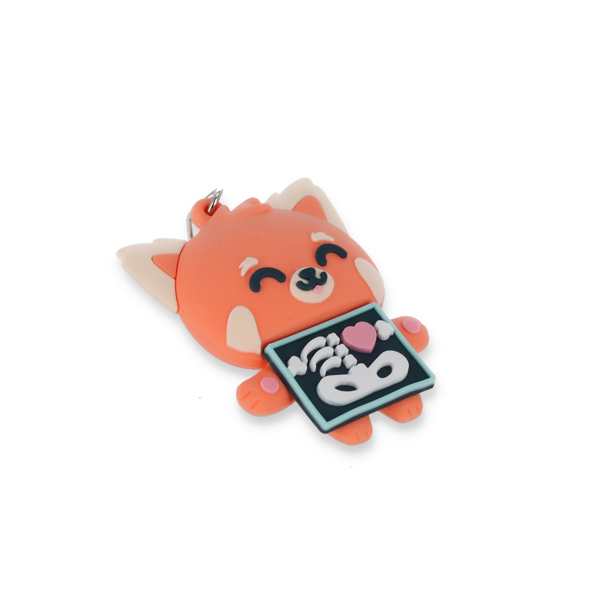 Porta-chaves feito de borracha com a forma de um divertido panda vermelho Sr. Maravilhoso a segurar um raio X.