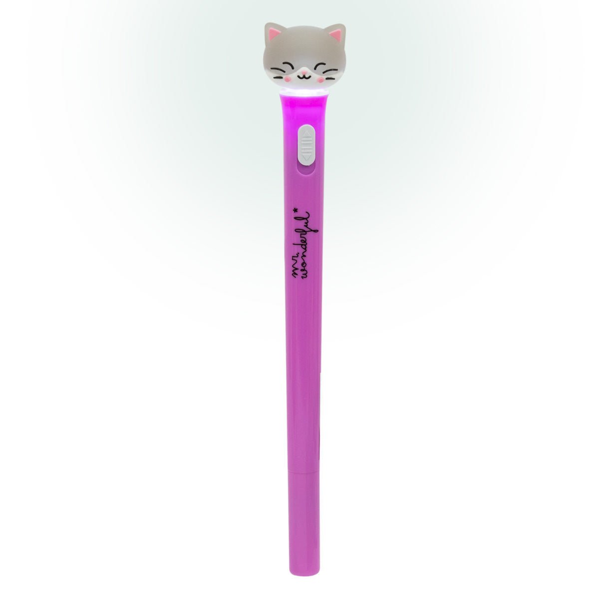 Caneta com um divertido gato do Sr. Maravilhoso em uma ponta, que acende quando você pressiona o interruptor no corpo da caneta.