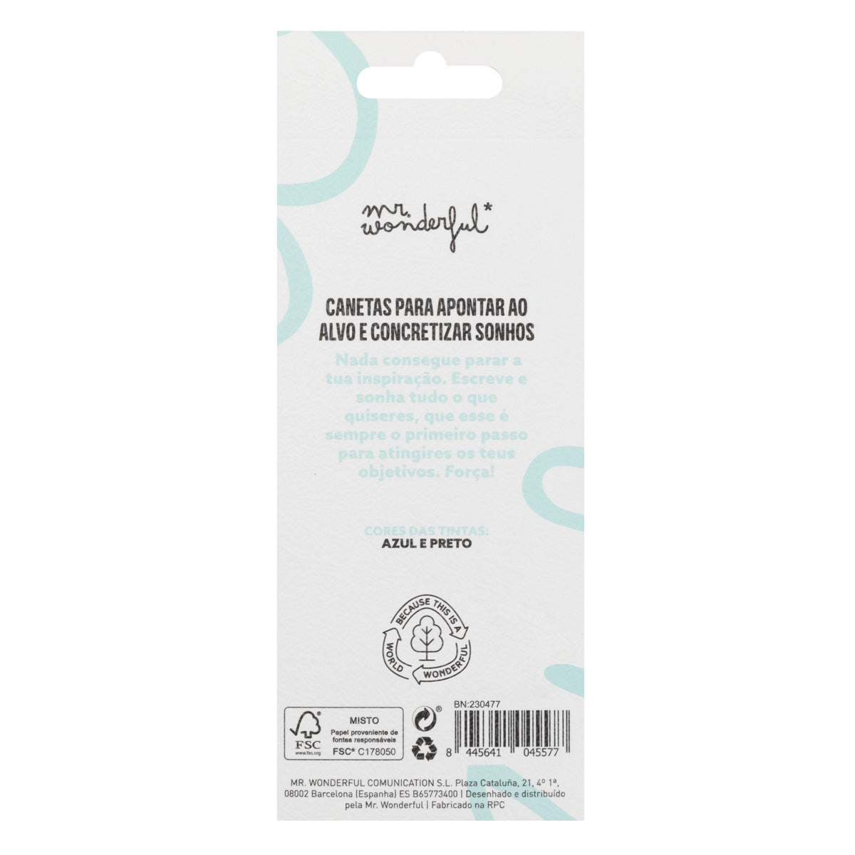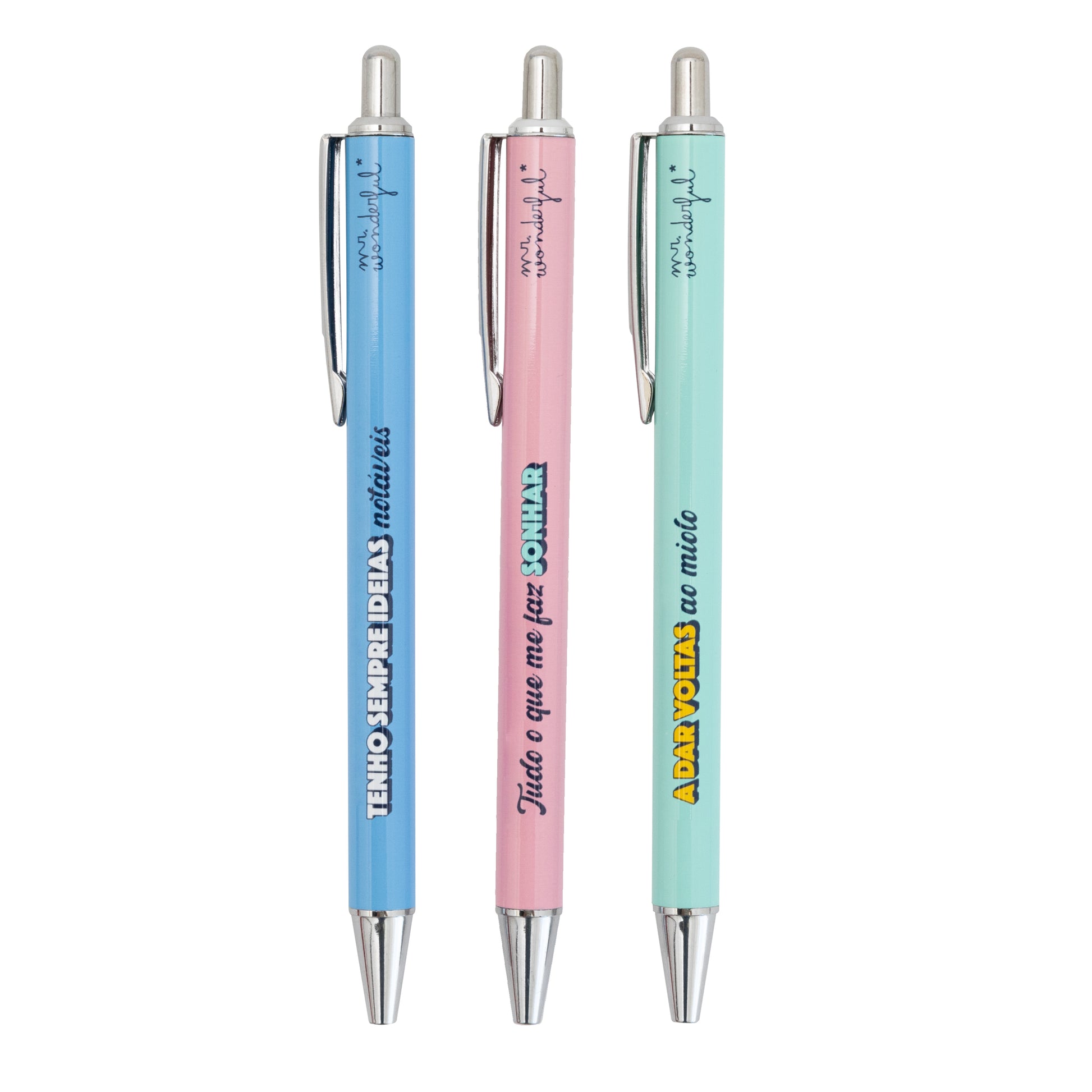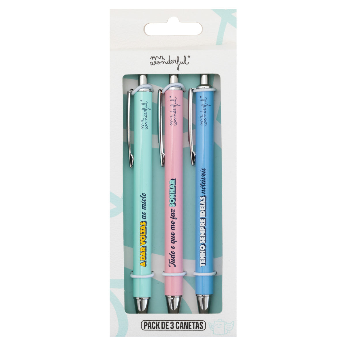 Conjunto de 3 canetas Mr. Wonderful com as mensagens: "A dar voltas ao miolo", "Tudo o que me faz sonhar" e "Sempre tenho ideias que você percebe". Uma combinação perfeita de tintas roxa e azul.