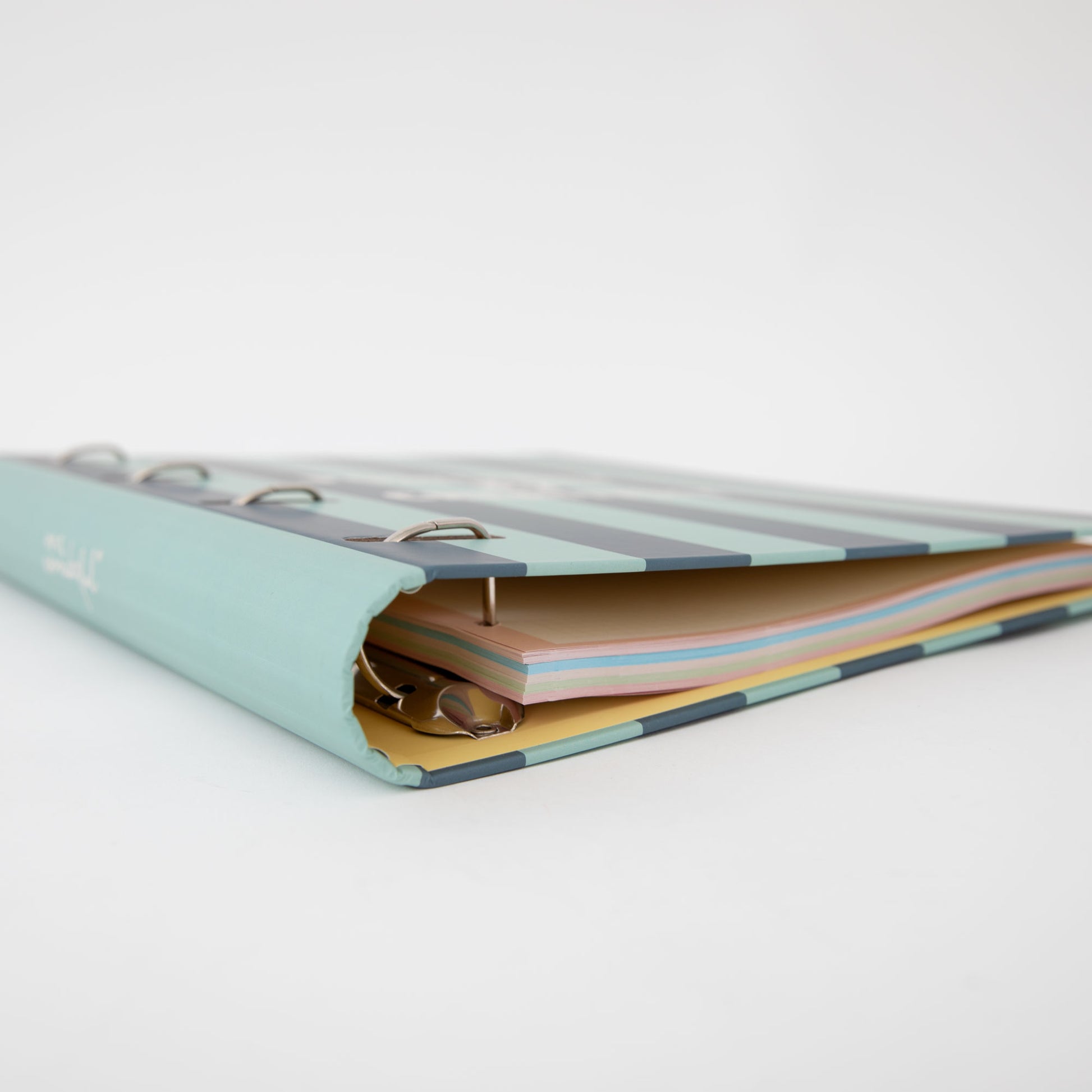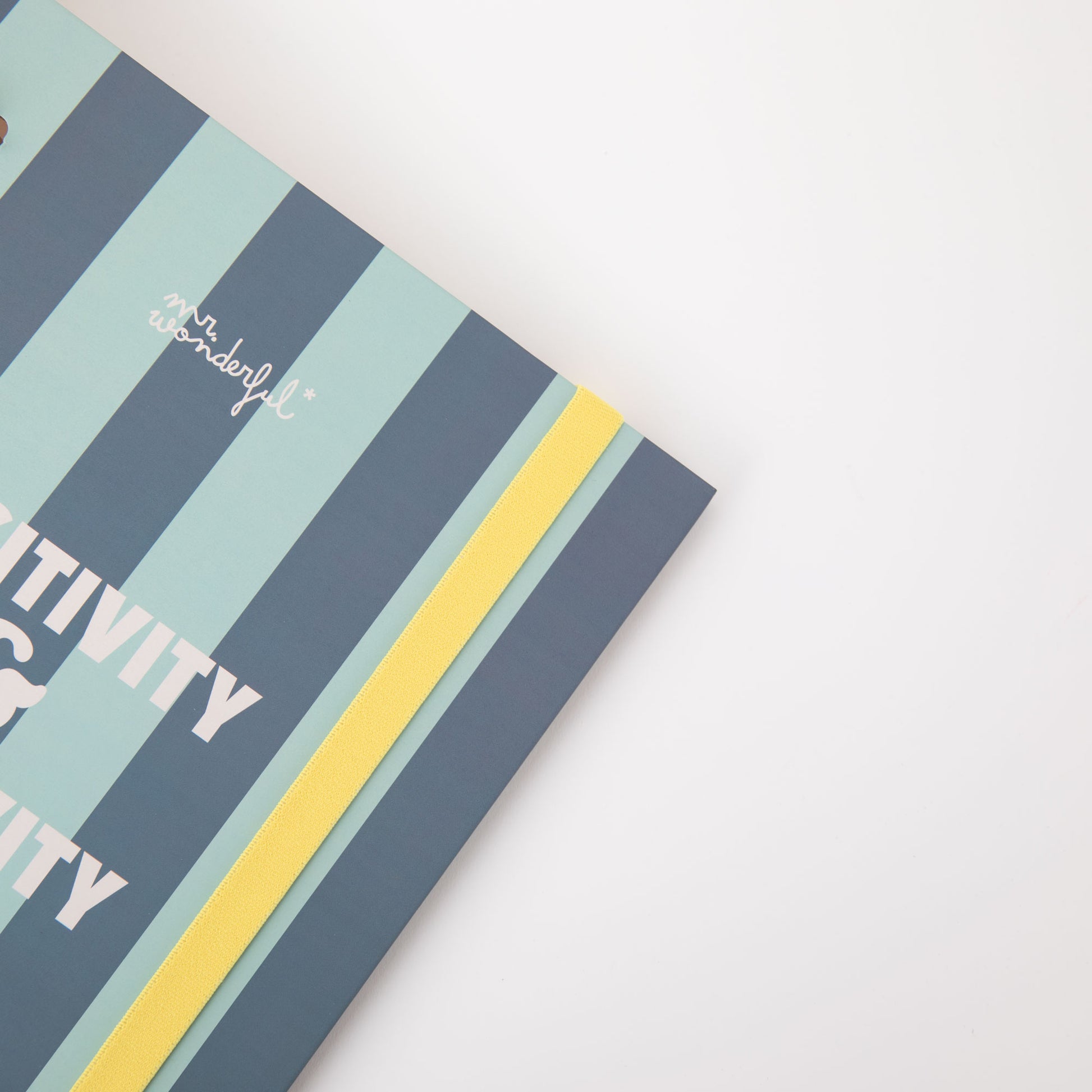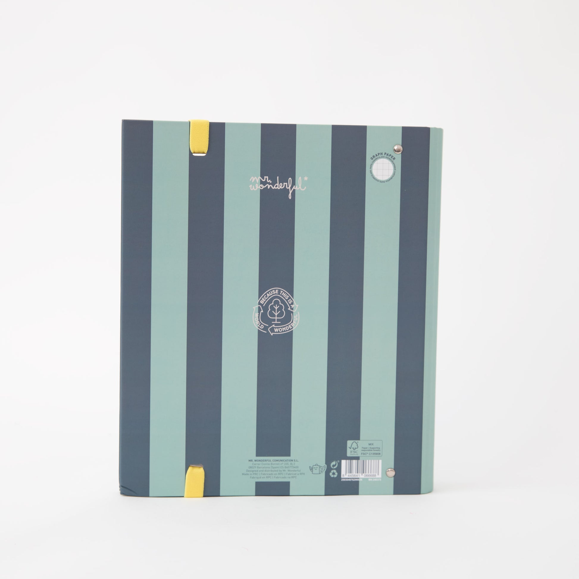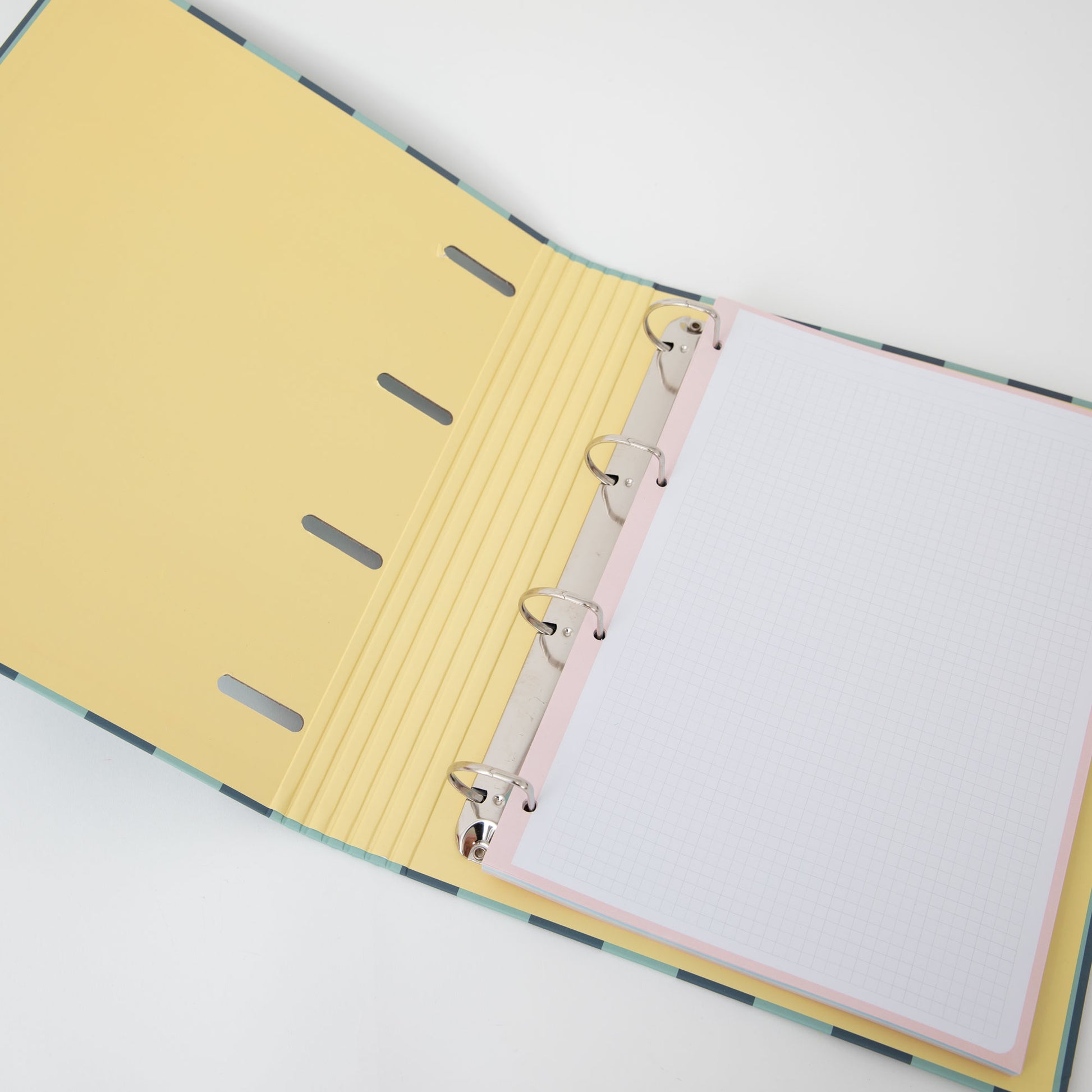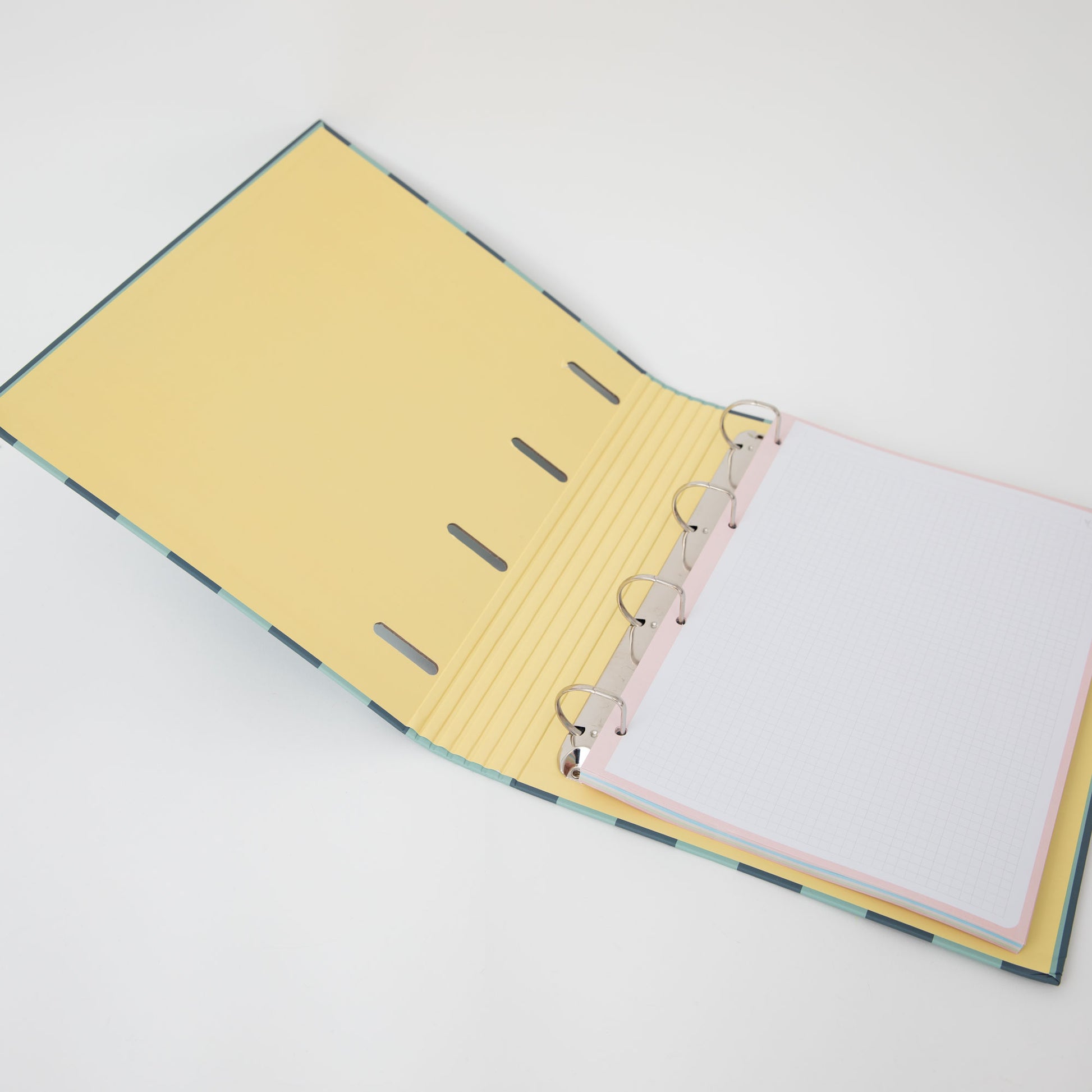 Pasta com 4 argolas, fechamento com elástico e proteção anti-riscos na capa. Com uma divertida mensagem em inglês. Inclui um refil de folhas quadriculadas (120 folhas de 90gsm).