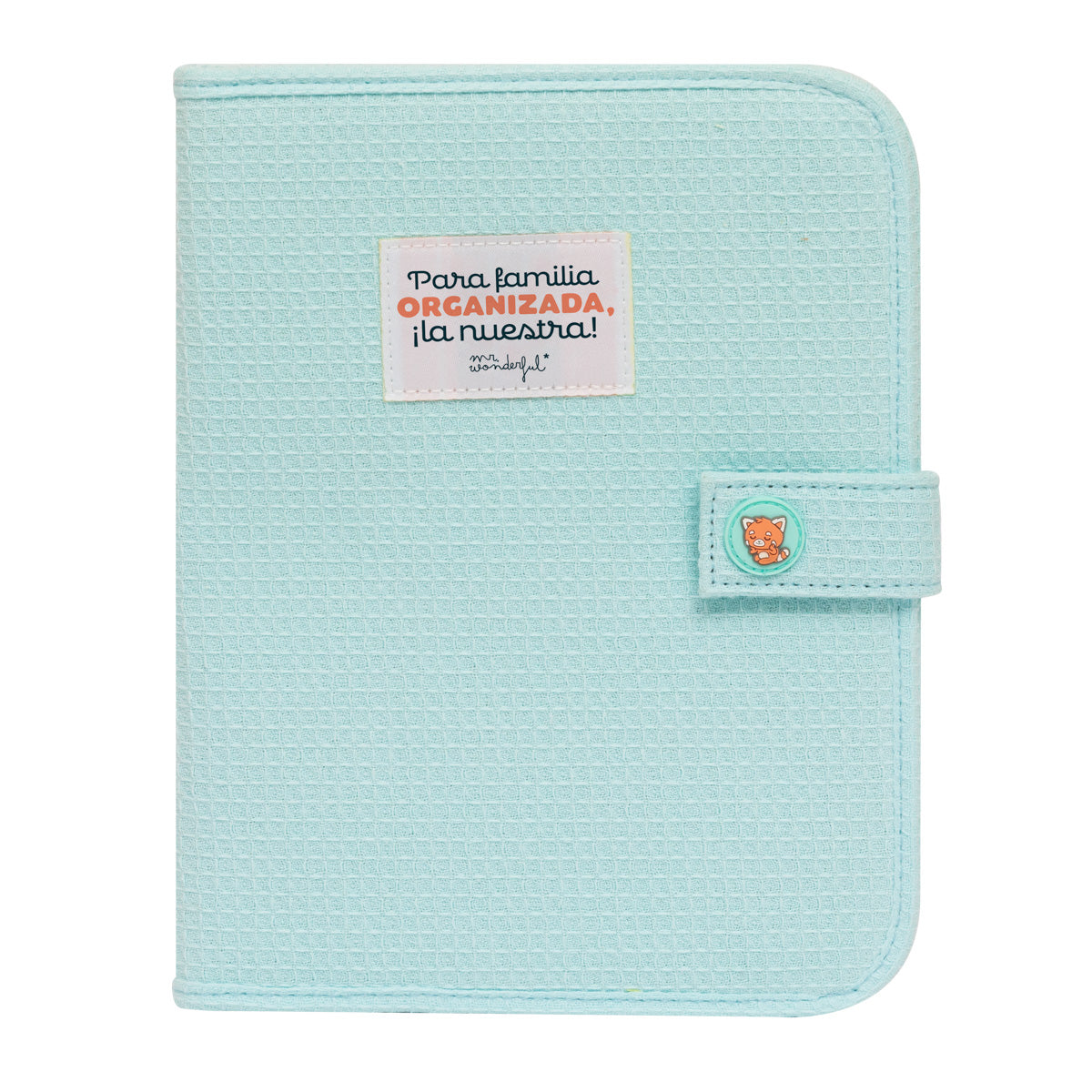 Porta-documentos familiar em algodão, na cor azul, com o panda vermelho Mr. Wonderful e fecho com botão de clique. Seu design é original e suave ao toque, além de contar com uma mensagem divertida em espanhol na parte frontal. Possui vários bolsos internos para manter todos os documentos da família organizados.