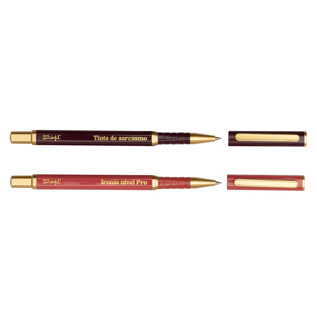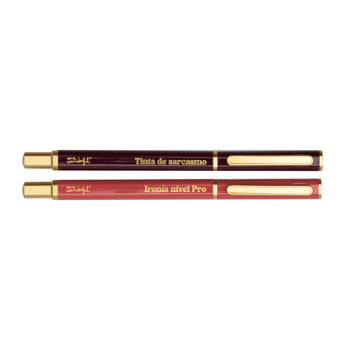 Conjunto de duas canetas com corpo em metal e tinta azul e preta, respetivamente. Cada caneta apresenta uma mensagem diferente.