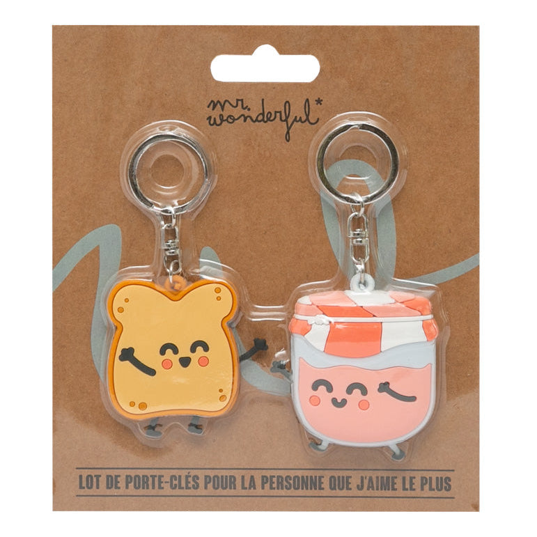 Conjunto de dois porte-clés em borracha. L'un d'eux a une form de tartine et l'autre, d'un pot à confiture.