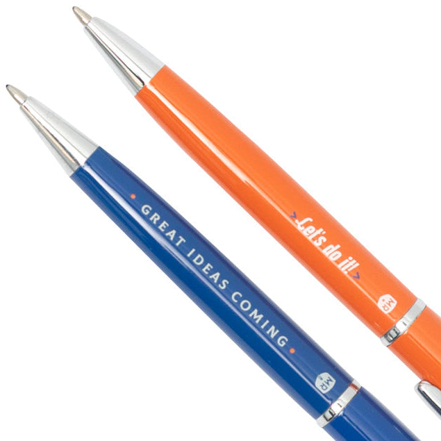 Conjunto de escrita composto por um estojo em metal e duas esferográficas no seu interior. As cores da tinta são o preto e o azul.