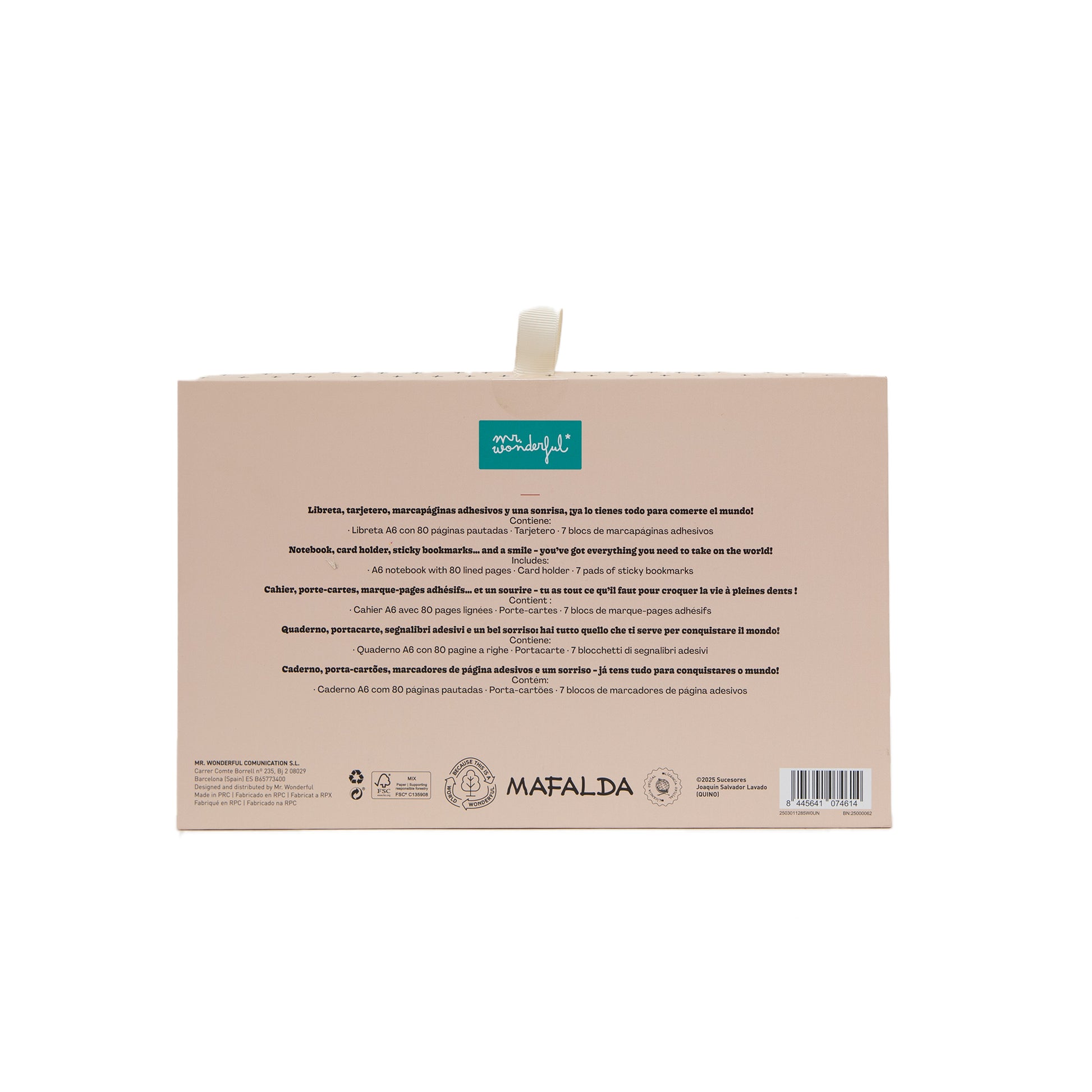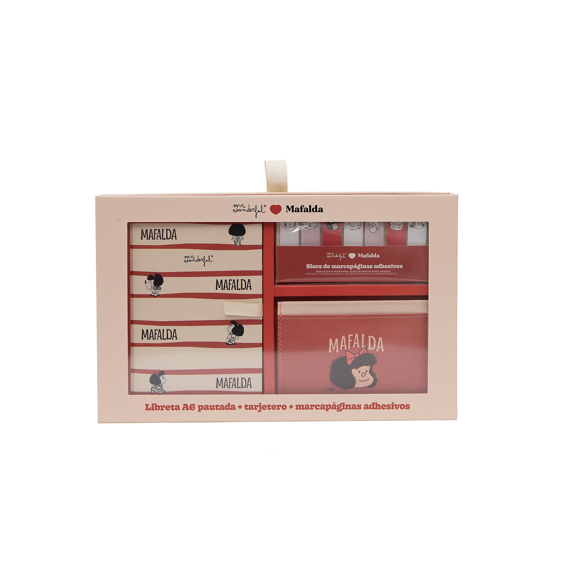 Set de regalo con Mafalda como protagonista, compuesto por una libreta A6 de encuadernación cosida y con 80 páginas pautadas, un tarjetero y 7 blocs de marcapáginas adhesivos.