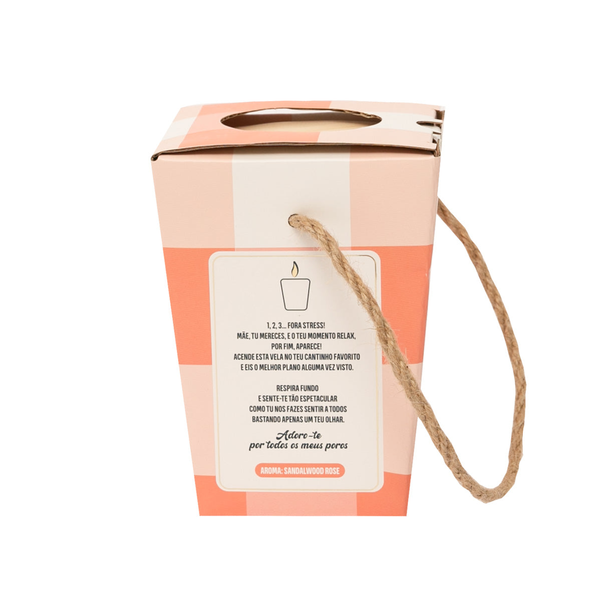 Vela aromática feita de cera vegetal e apresentada em embalagem de vidro, onde está impressa uma mensagem dirigida a si. Inclui tampa de madeira. Aroma: Rosa de sândalo.