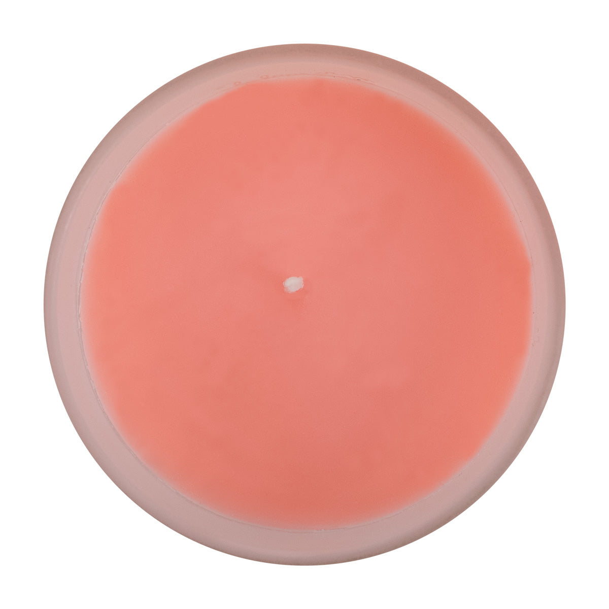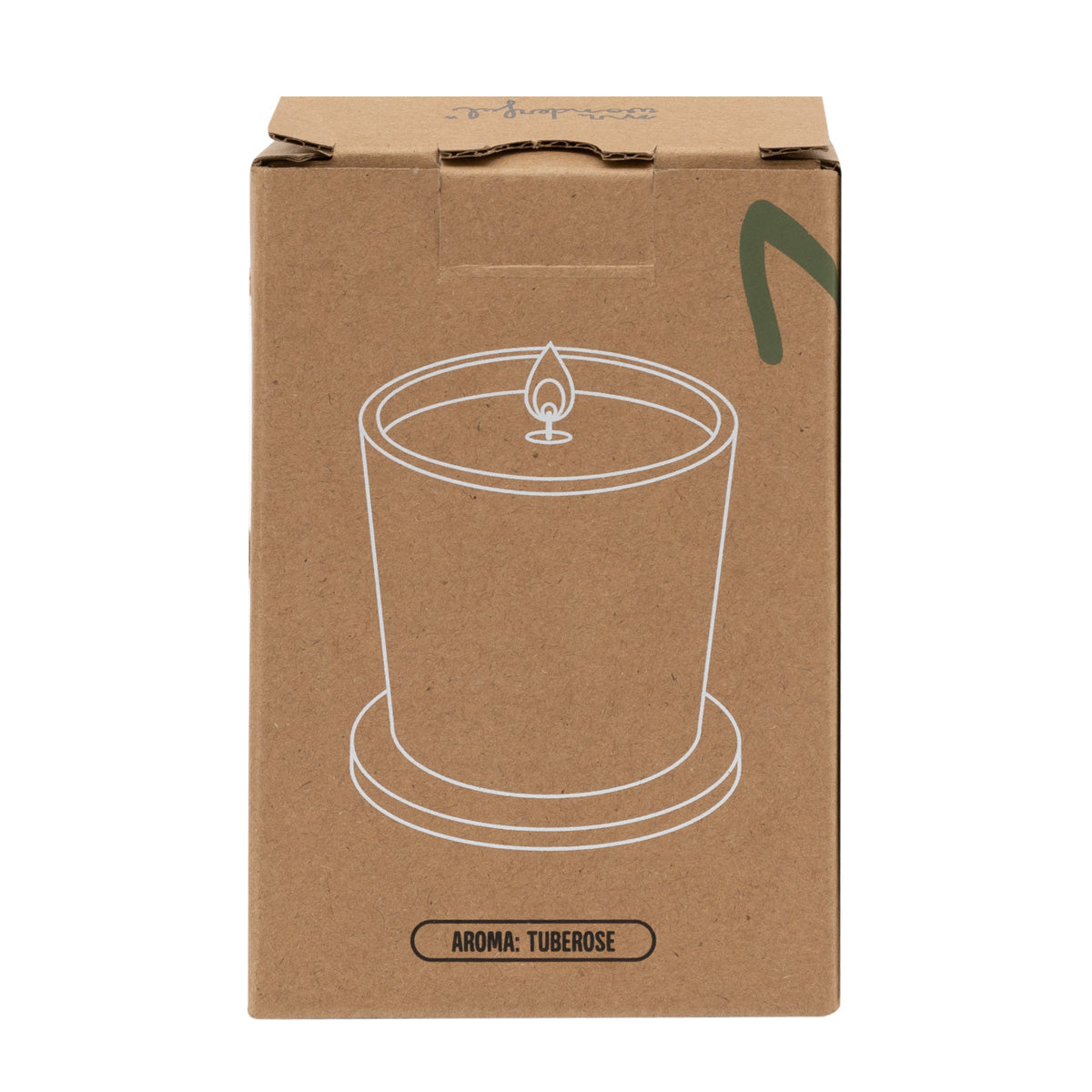 Vela feita de cera vegetal colorida, apresentada num recipiente de vidro transparente. Aroma: tuberosa.